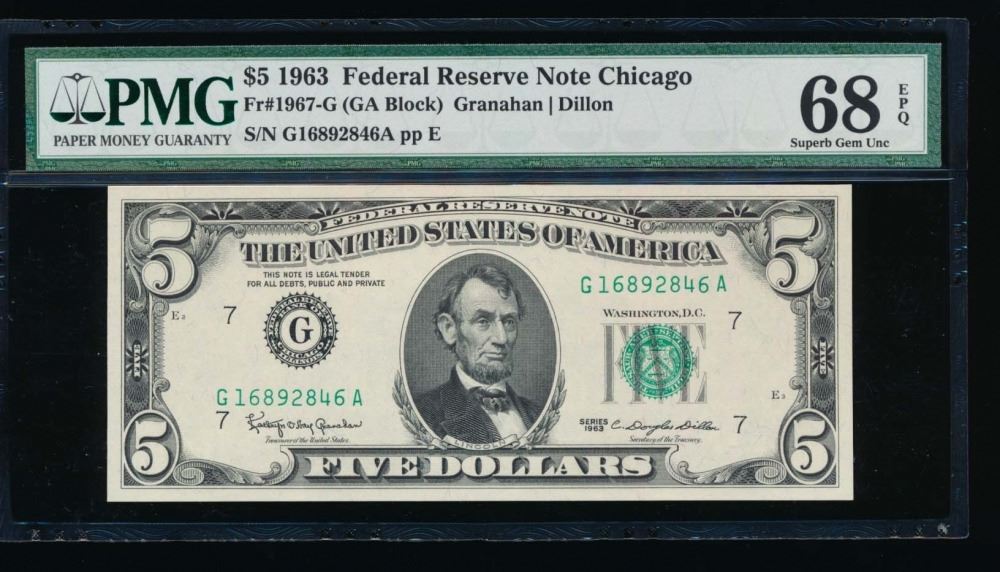 One 1963 $5 Chicago Federal Reserve Note PMG 68EPQ.
