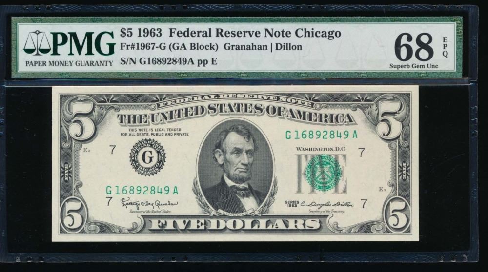 One 1963 $5 Chicago Federal Reserve Note PMG 68EPQ.