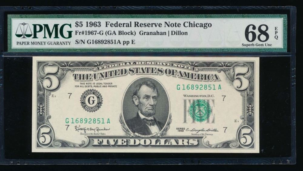 One 1963 $5 Chicago Federal Reserve Note PMG 68EPQ.