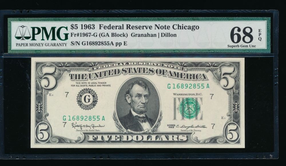 One 1963 $5 Chicago Federal Reserve Note PMG 68EPQ.