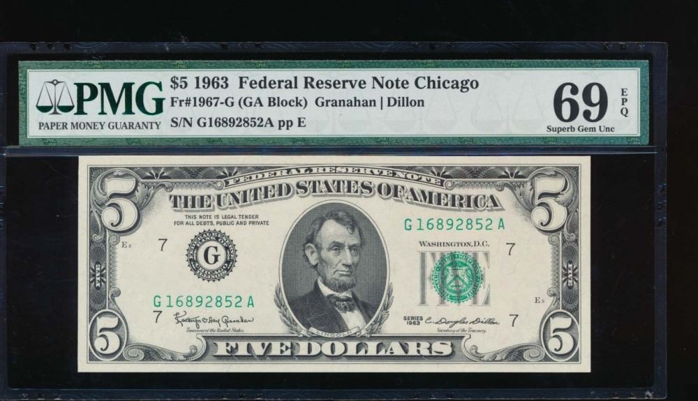 One 1963 $5 Chicago Federal Reserve Note PMG 69EPQ.