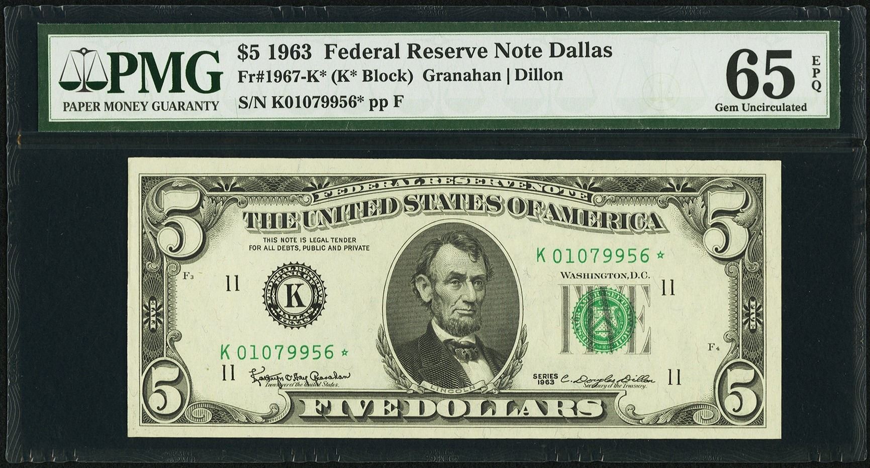 One 1963 $5 Dallas Federal Reserve STAR Note PMG 65EPQ.