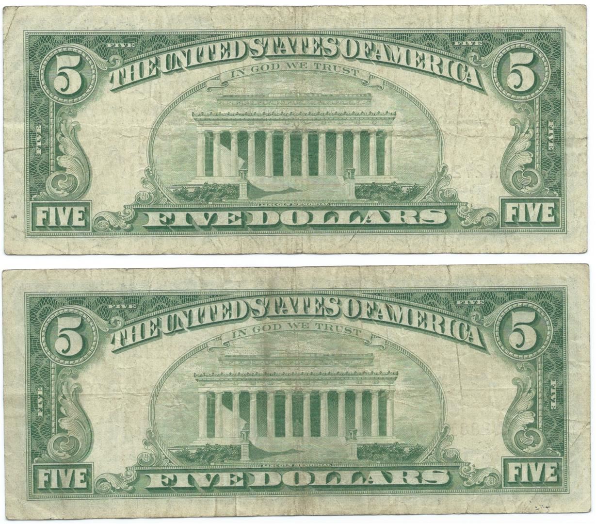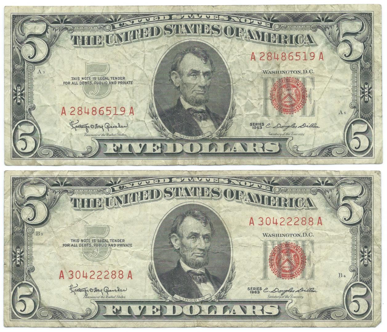 One 1963 $5 Fine Red Seal Bill Lot of 2.