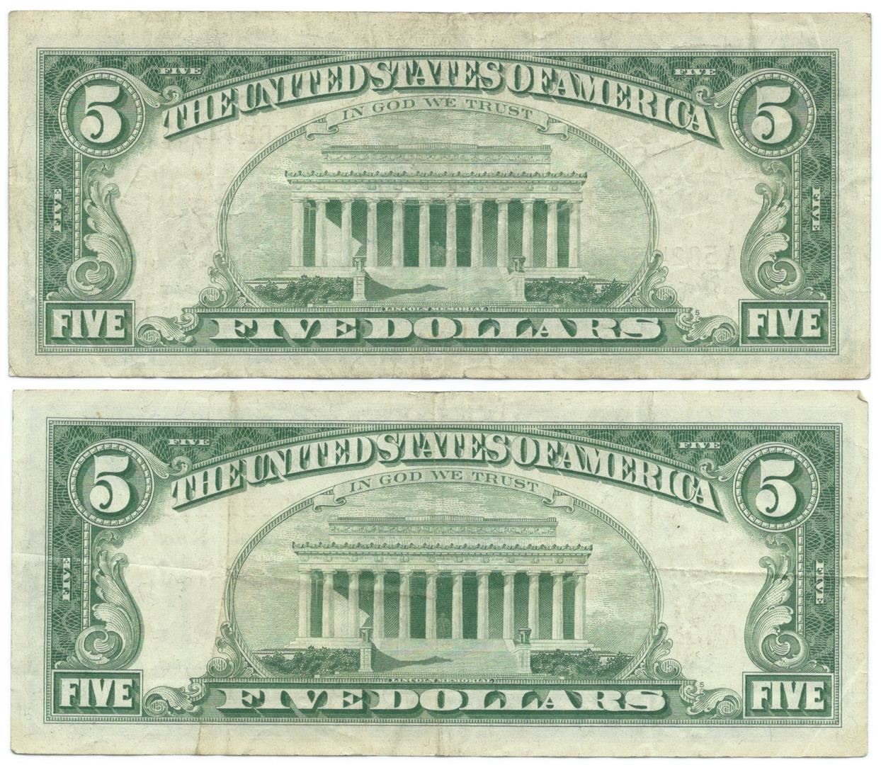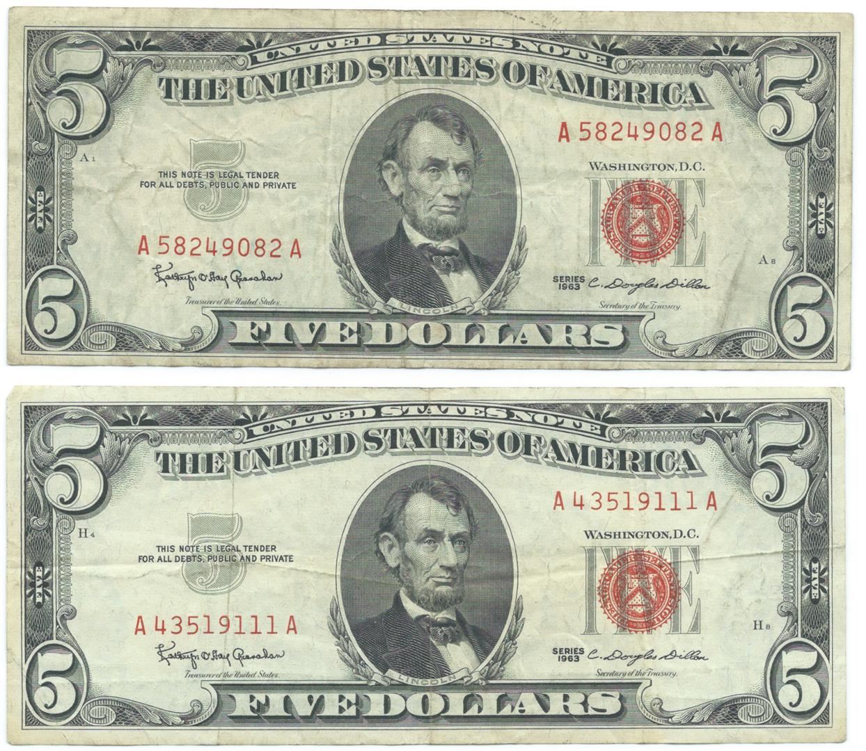One 1963 $5 Fine Red Seal Bill Lot of 2.