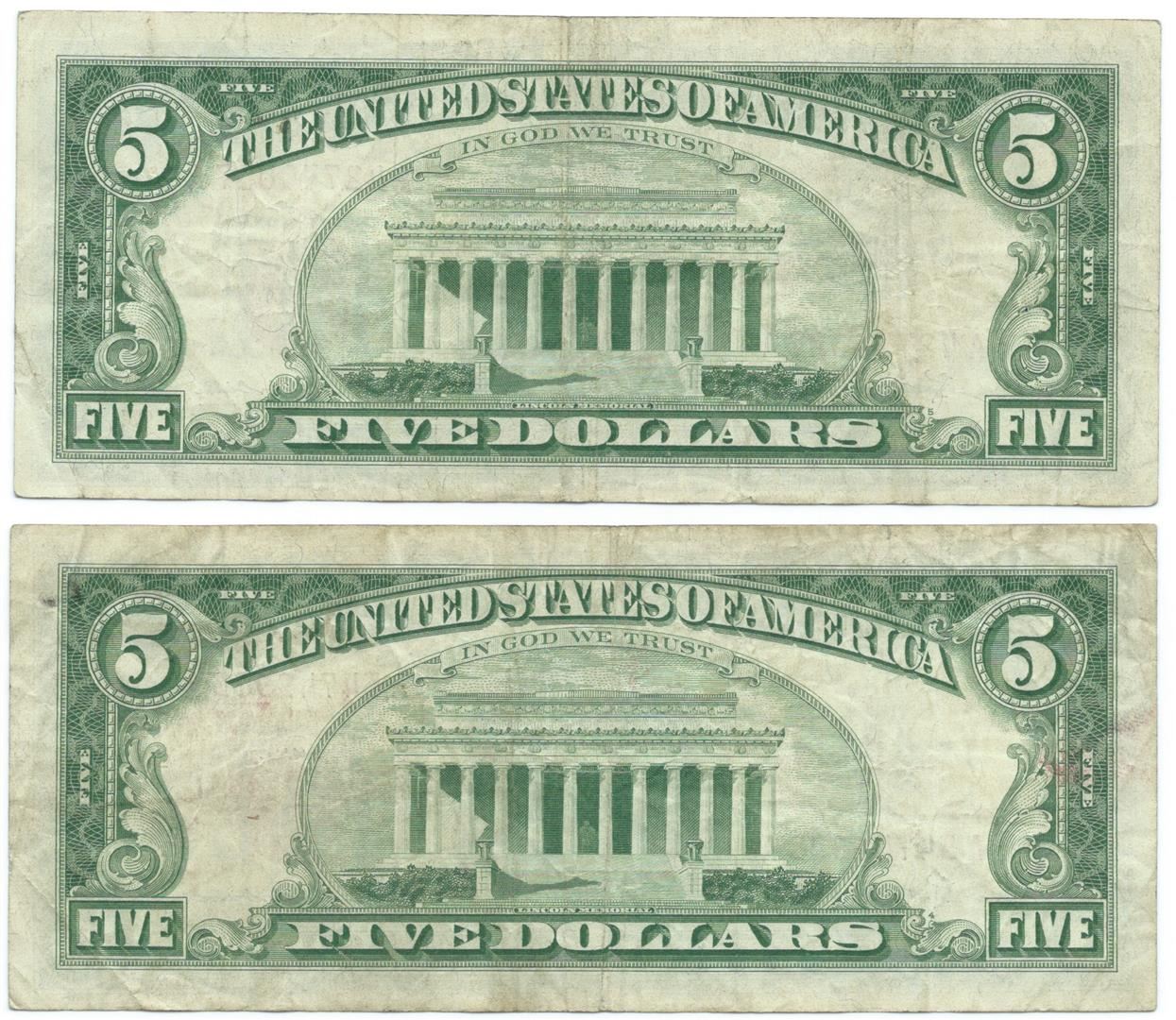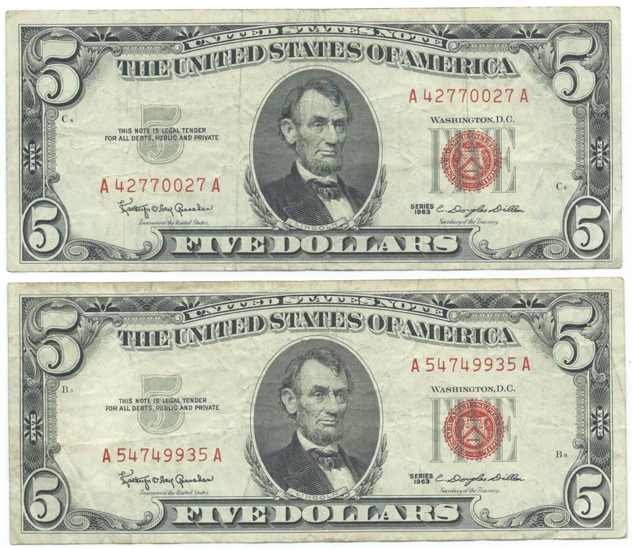 One 1963 $5 Fine Red Seal Bill Lot of 2.