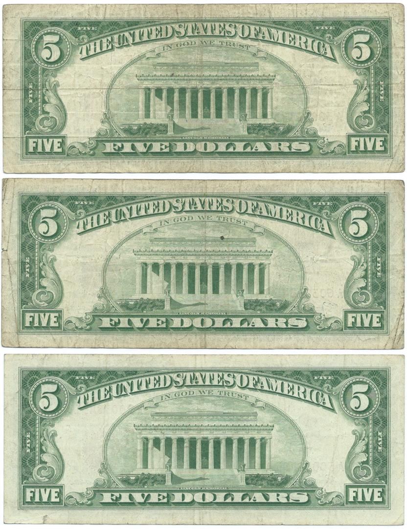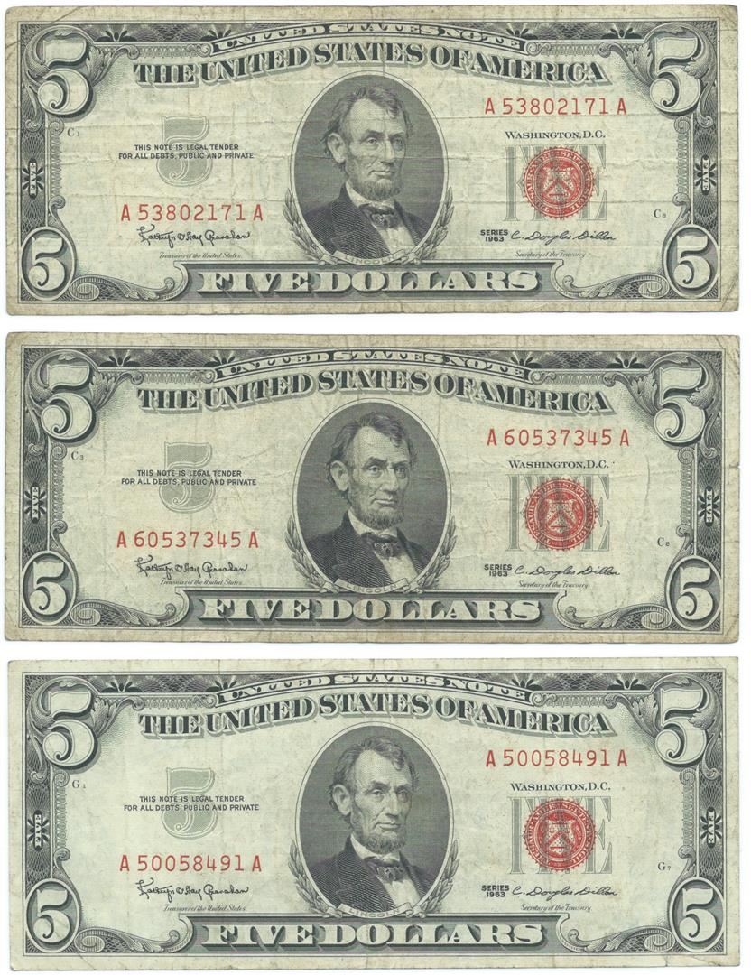 One 1963 $5 Fine Red Seal Bill Lot of 3.