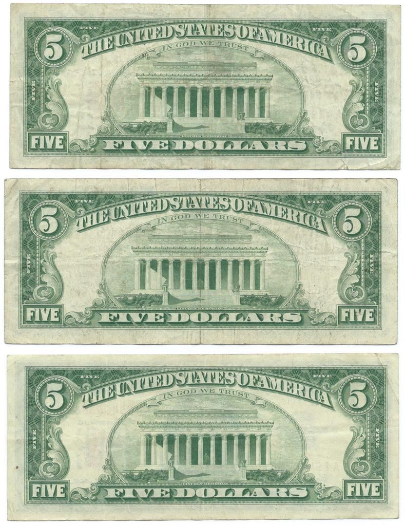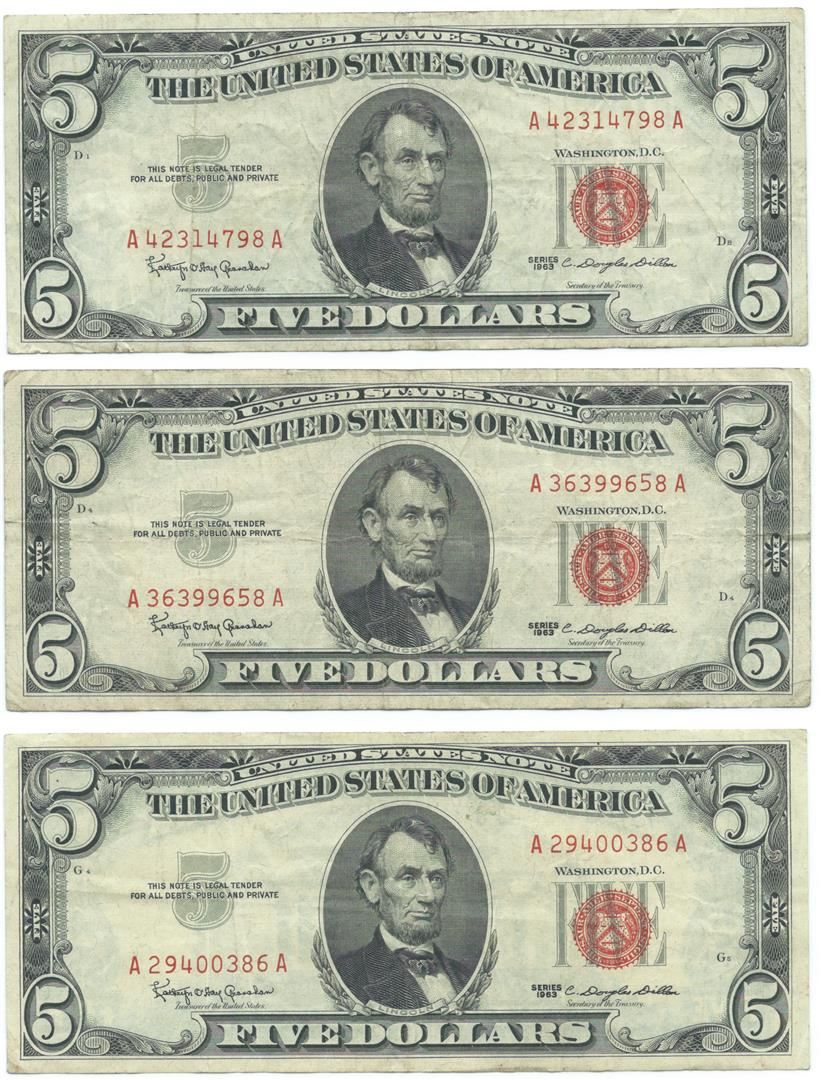 One 1963 $5 Fine Red Seal Bill Lot of 3.