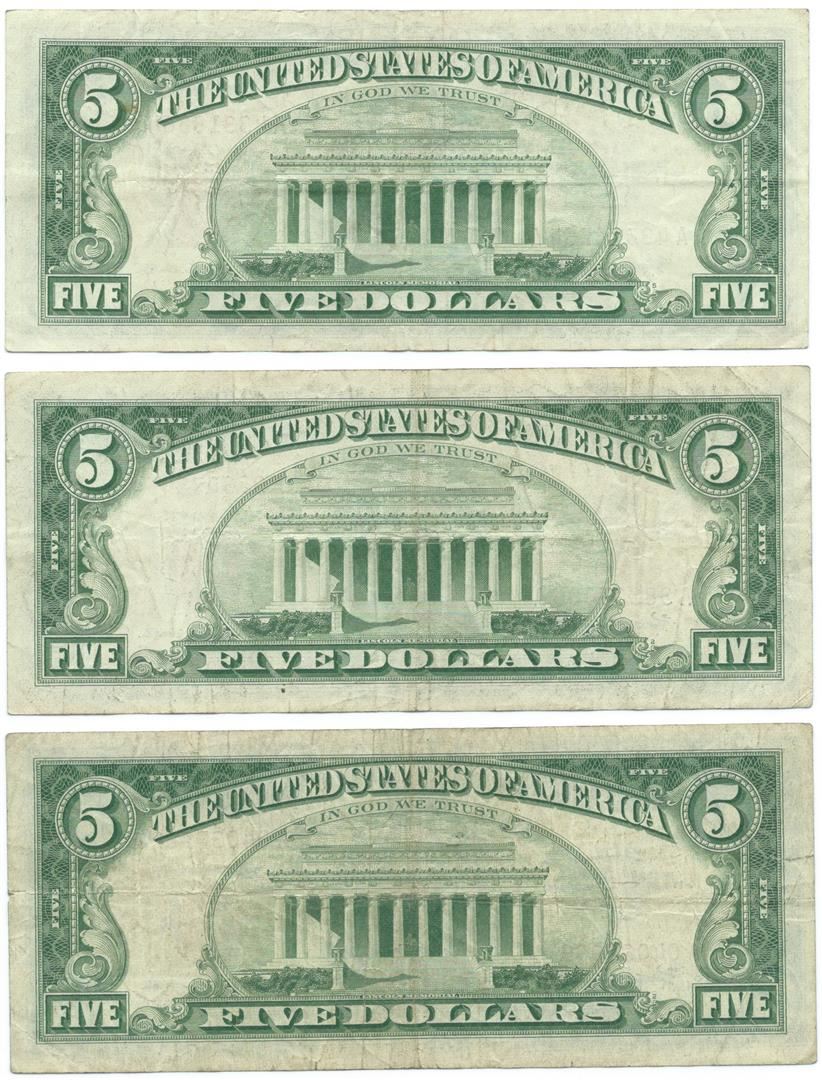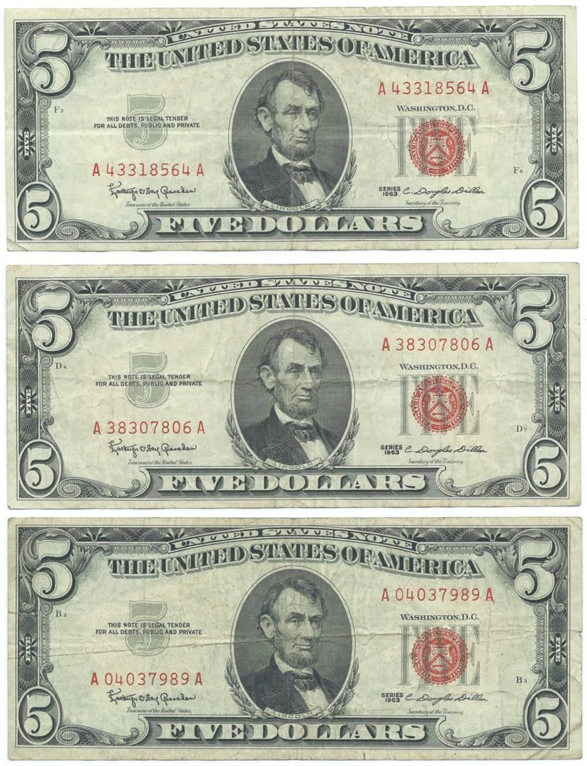One 1963 $5 Fine Red Seal Bill Lot of 3.