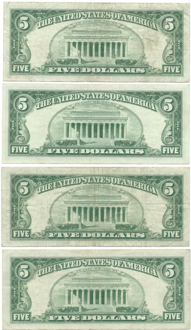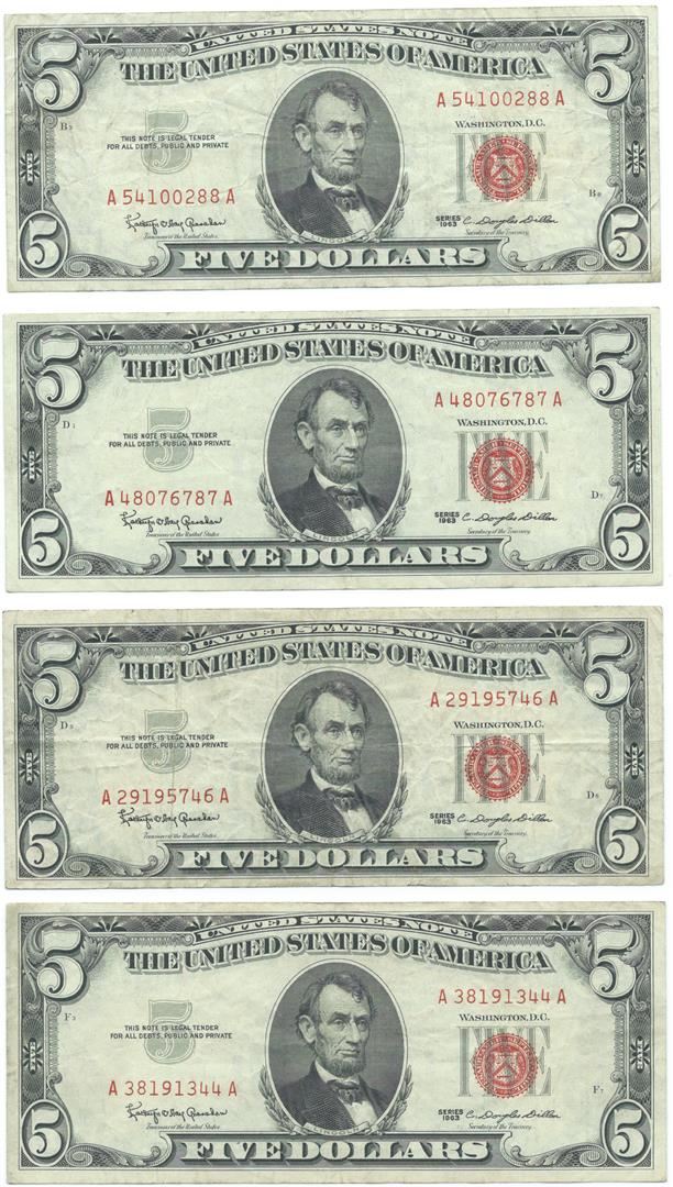 One 1963 $5 Fine Red Seal Bill Lot of 4.