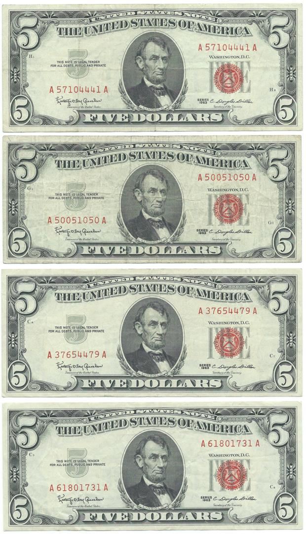 One 1963 $5 Fine Red Seal Bill Lot of 4.