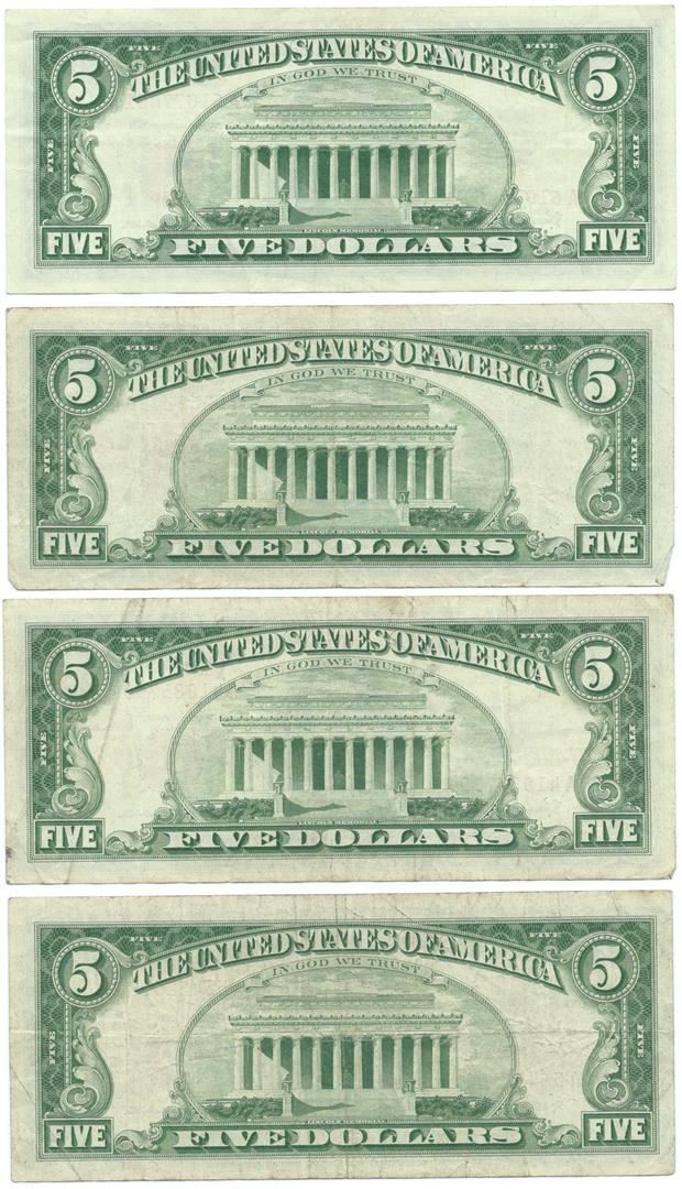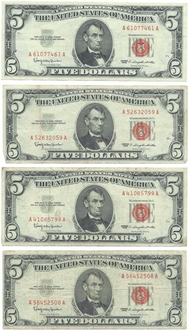 One 1963 $5 Fine Red Seal Bill Lot of 4.