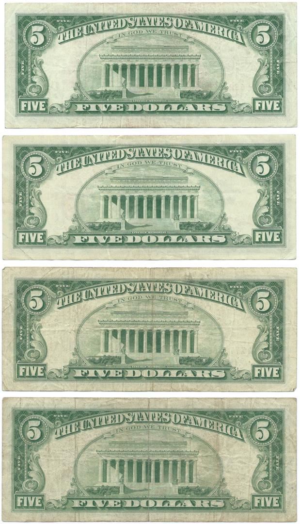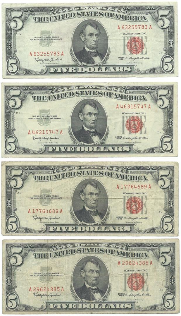 One 1963 $5 Fine Red Seal Bill Lot of 4.