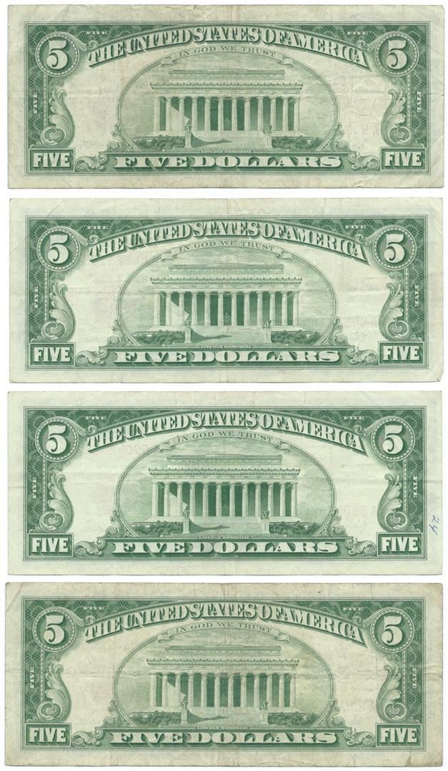 One 1963 $5 Fine Red Seal Bill Lot of 4.