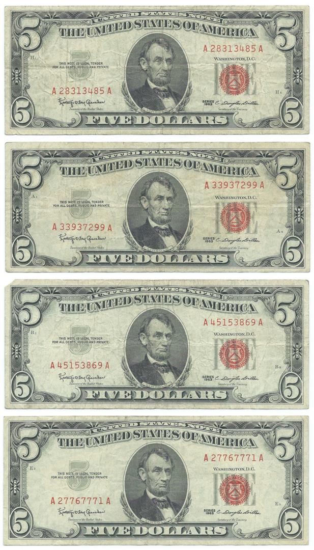 One 1963 $5 Fine Red Seal Bill Lot of 4.