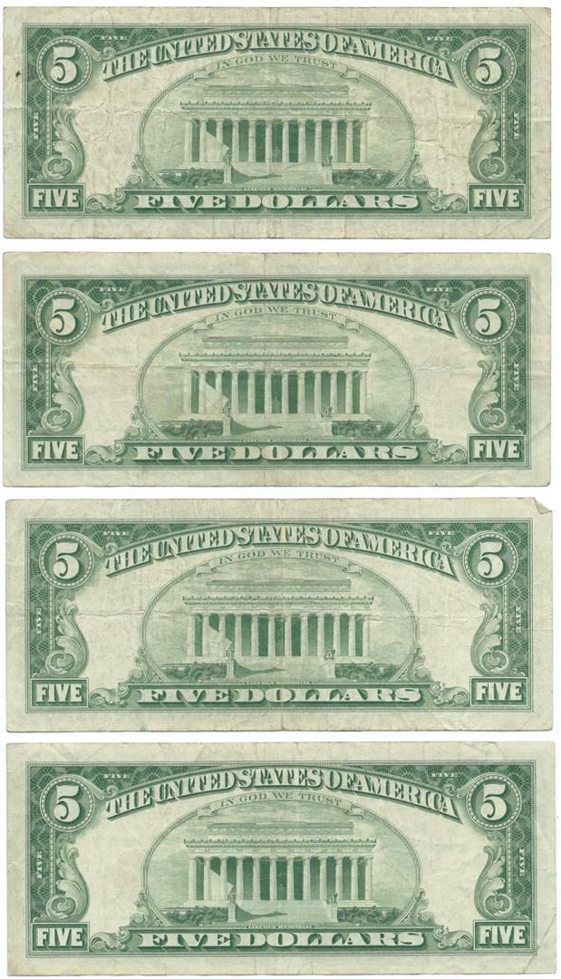 One 1963 $5 Fine Red Seal Bill Lot of 4.