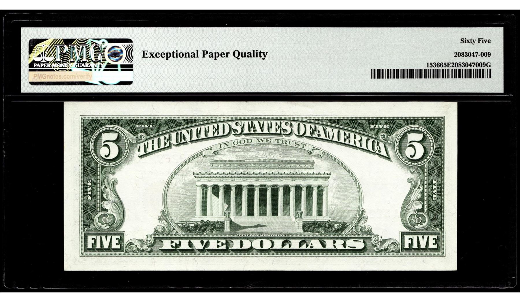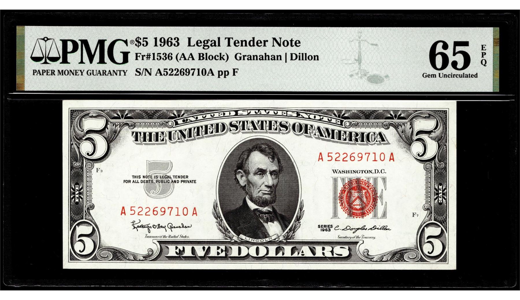 One 1963 $5 Legal Tender Note Fr.1536 PMG Gem Uncirculated 65EPQ. PMG Certified.