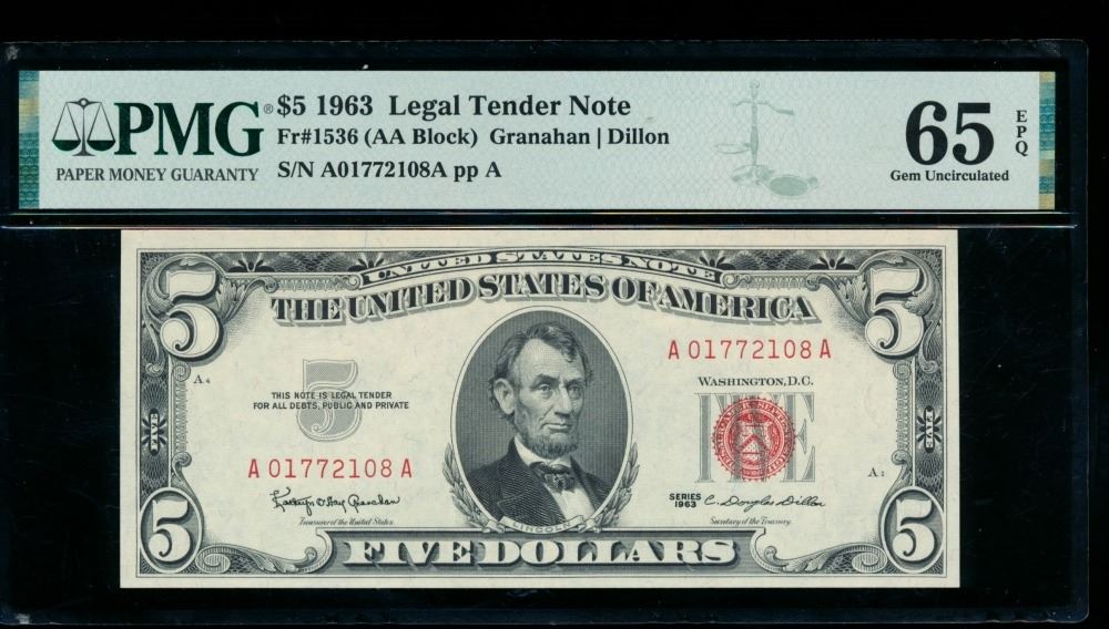 One 1963 $5 Legal Tender Note PMG 65EPQ.