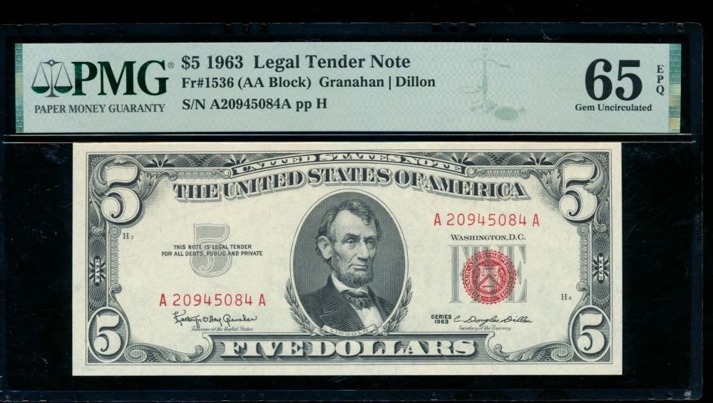 One 1963 $5 Legal Tender Note PMG 65EPQ.