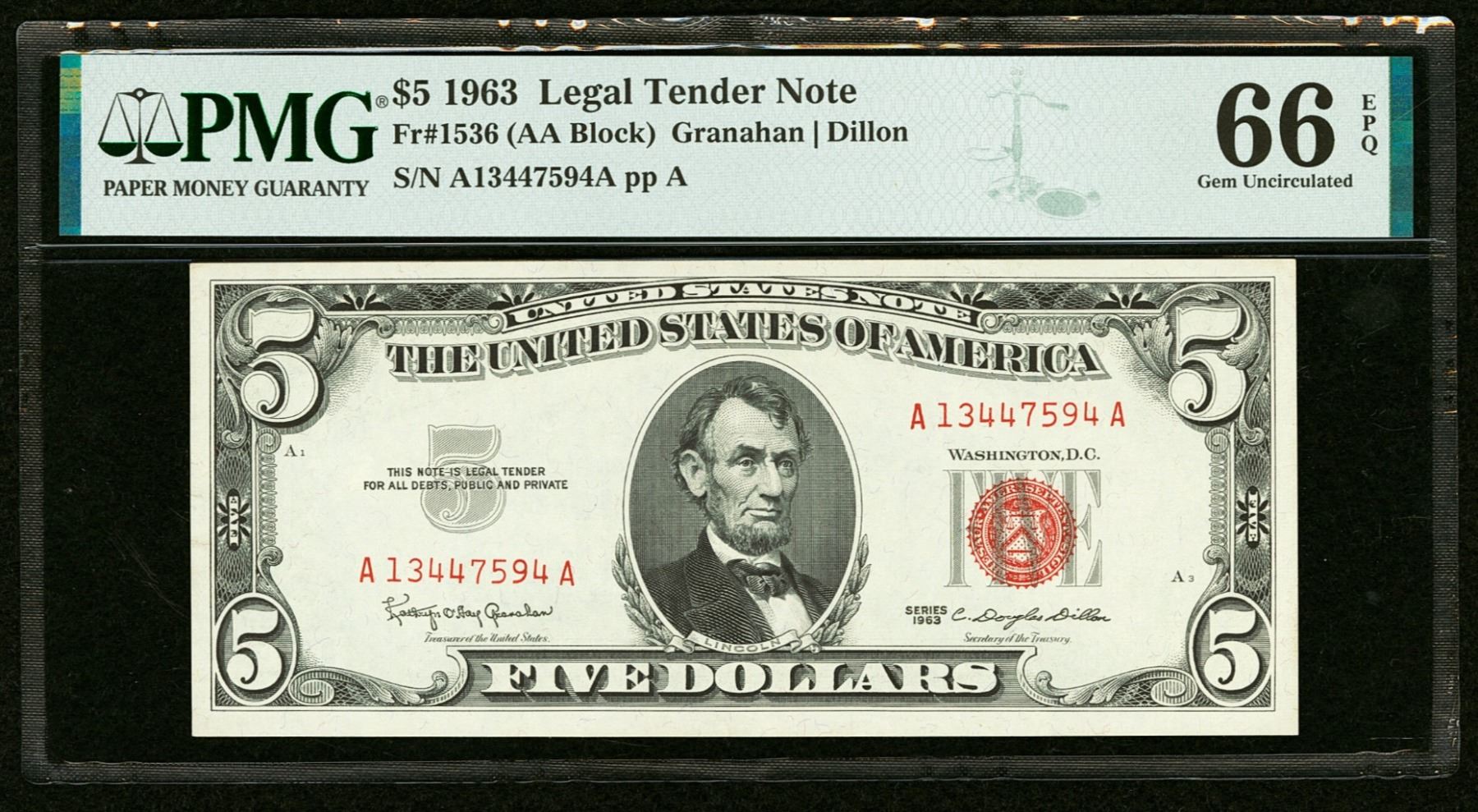 One 1963 $5 Legal Tender Note PMG 66EPQ.