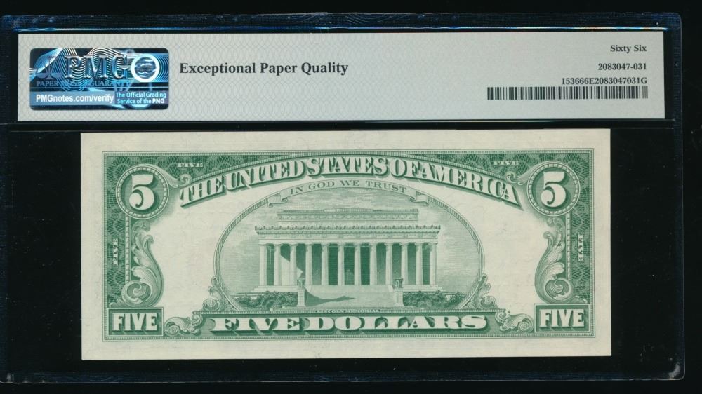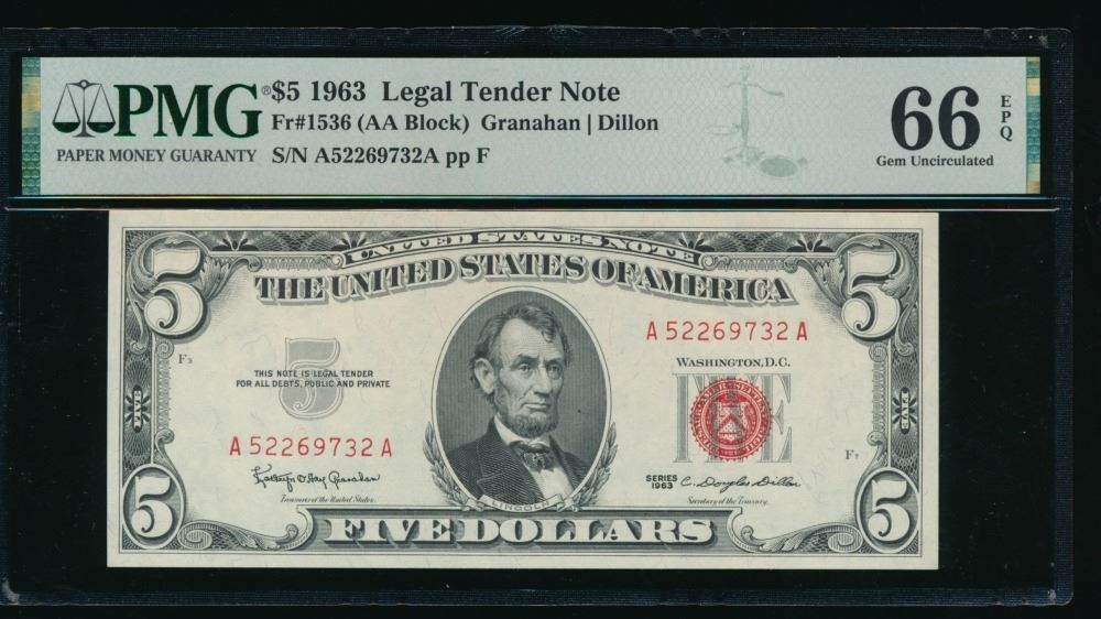 One 1963 $5 Legal Tender Note PMG 66EPQ.