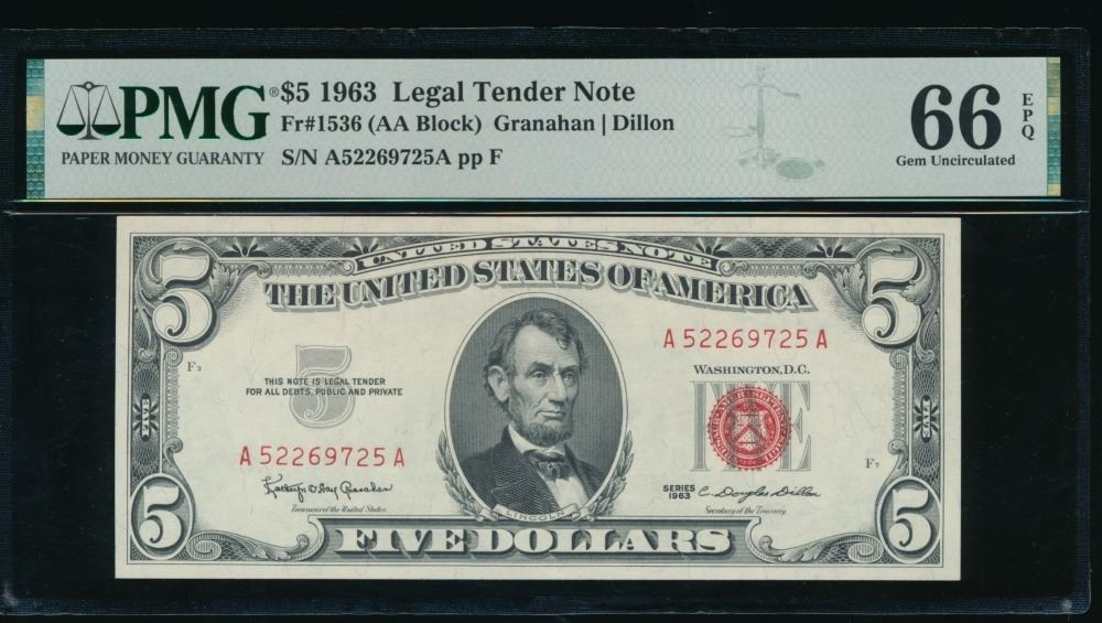 One 1963 $5 Legal Tender Note PMG 66EPQ.