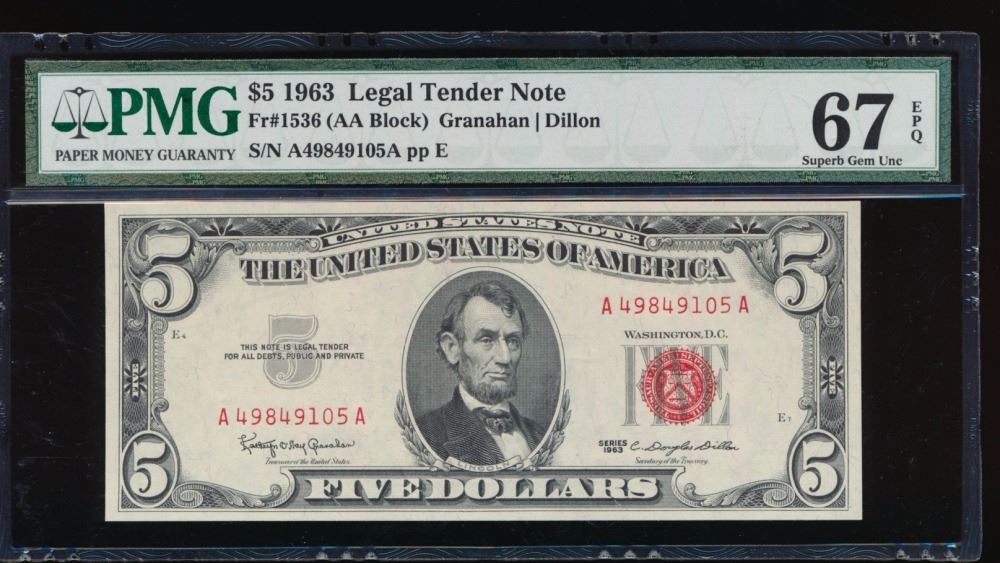 One 1963 $5 Legal Tender Note PMG 67EPQ.