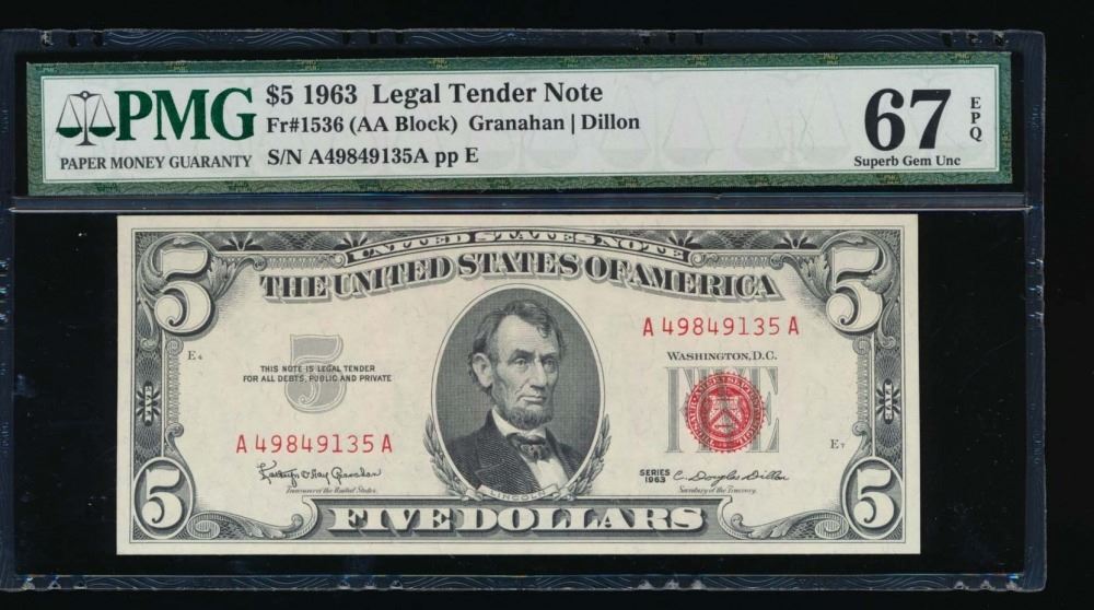 One 1963 $5 Legal Tender Note PMG 67EPQ.