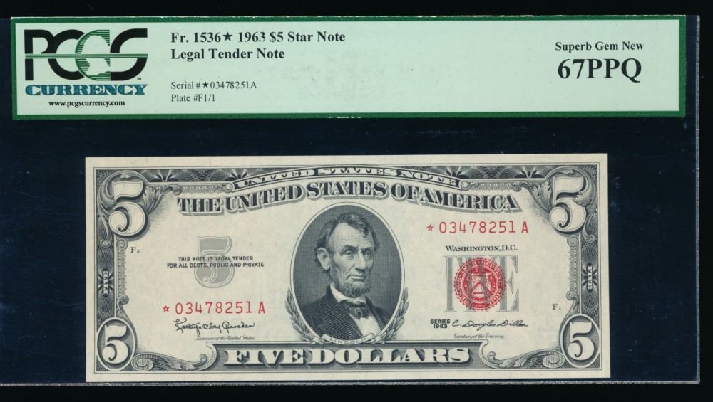 One 1963 $5 Legal Tender STAR Note PCGS 67PPQ.