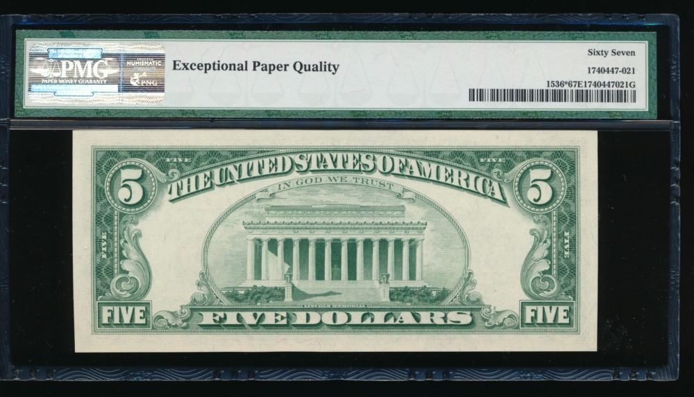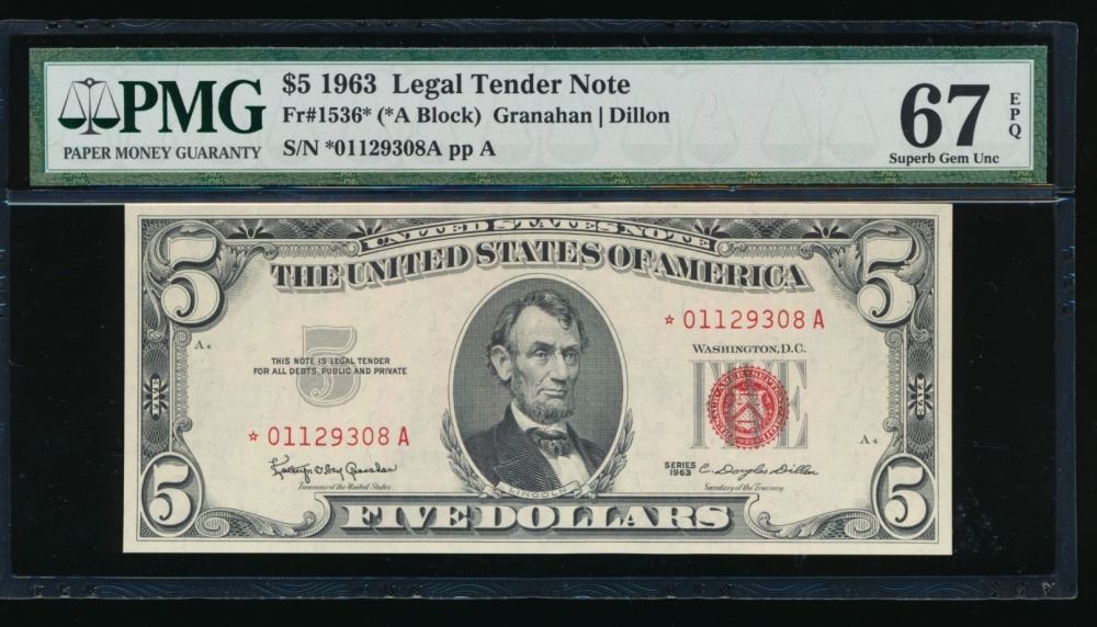 One 1963 $5 Legal Tender STAR Note PMG 67EPQ.