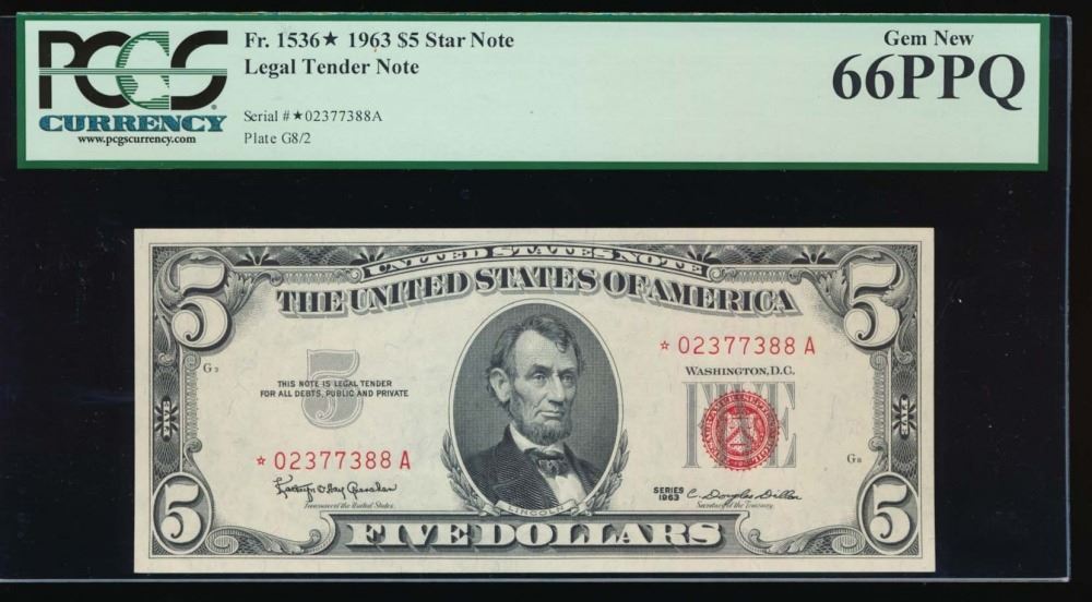 One 1963 $5 Legal Tender Star Note PCGS 66PPQ.