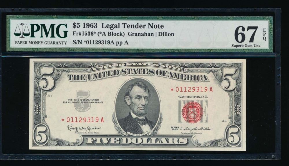 One 1963 $5 Legal Tender Star Note PMG 67EPQ.