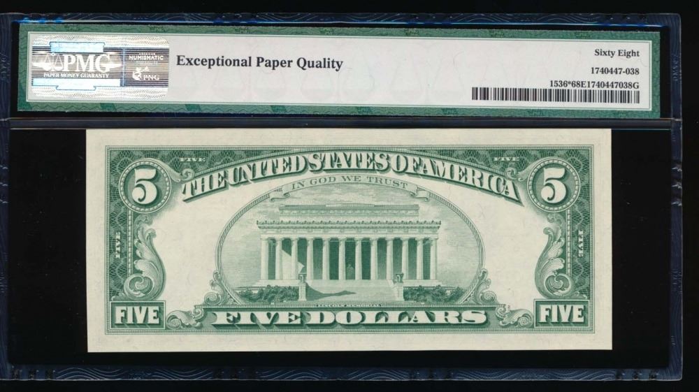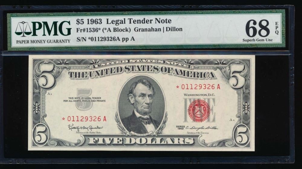 One 1963 $5 Legal Tender Star Note PMG 68EPQ.