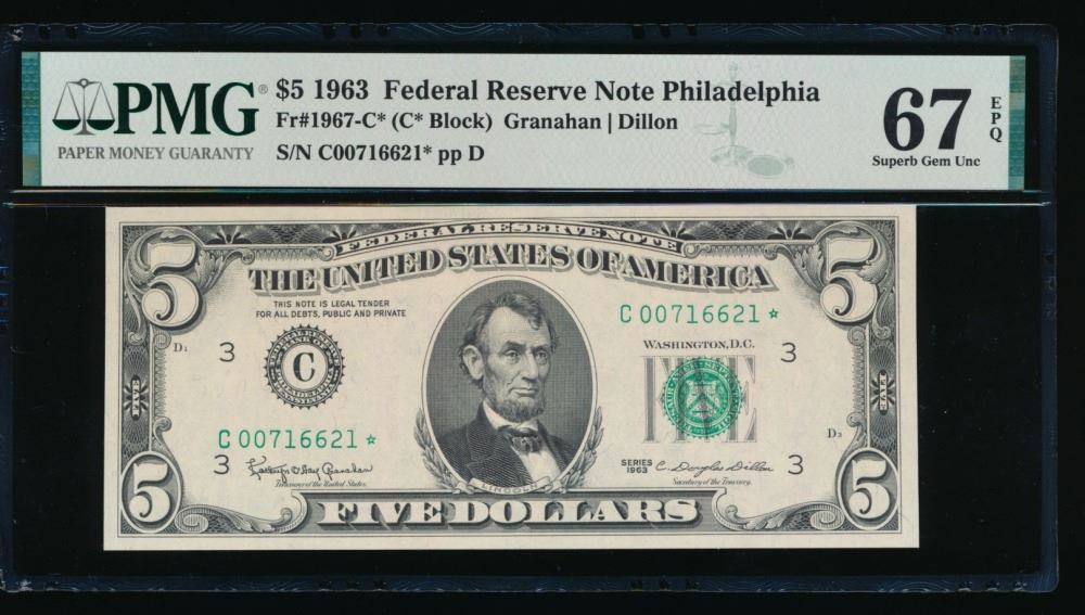 One 1963 $5 Philadelphia Federal Reserve STAR Note PMG 67EPQ.