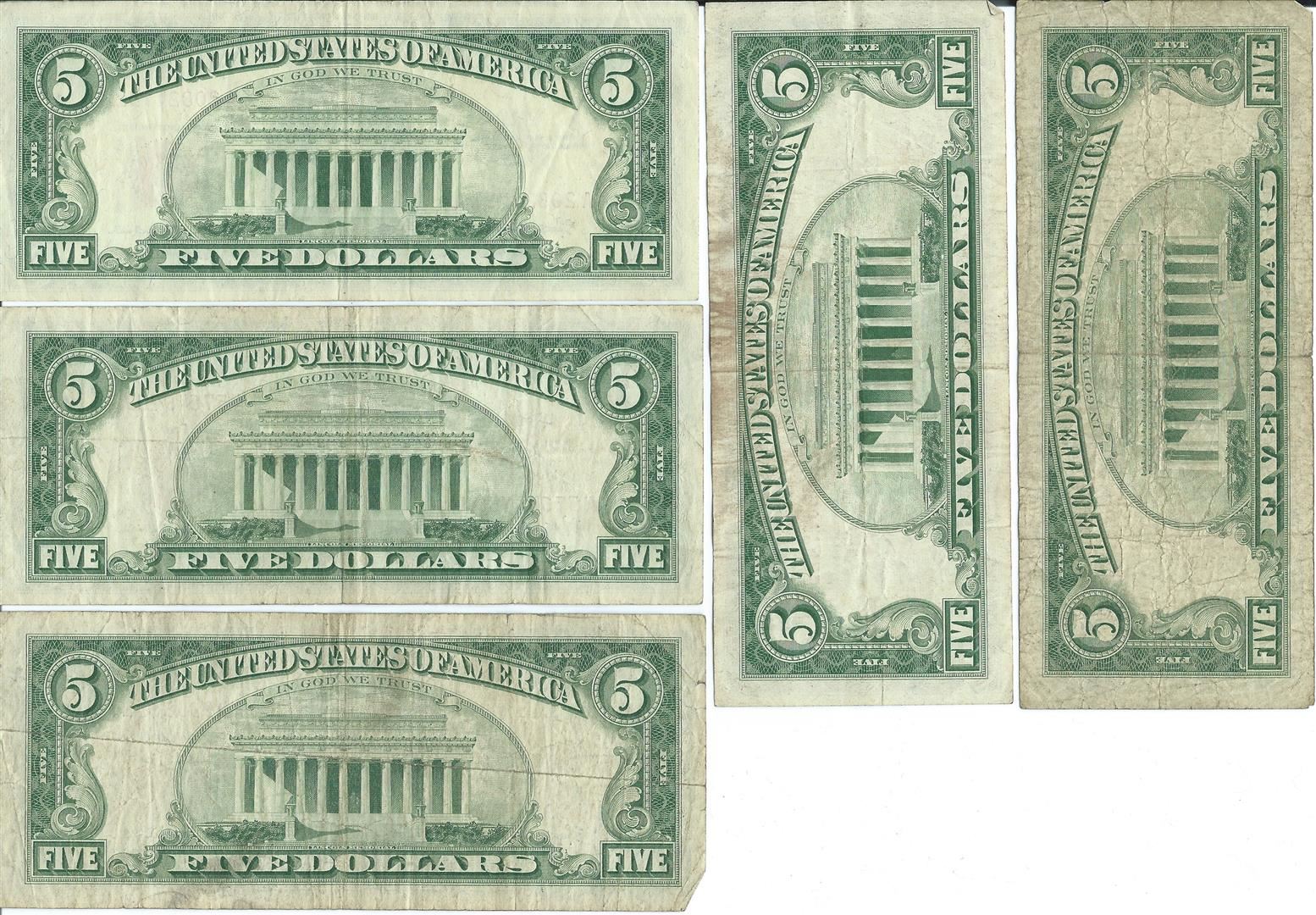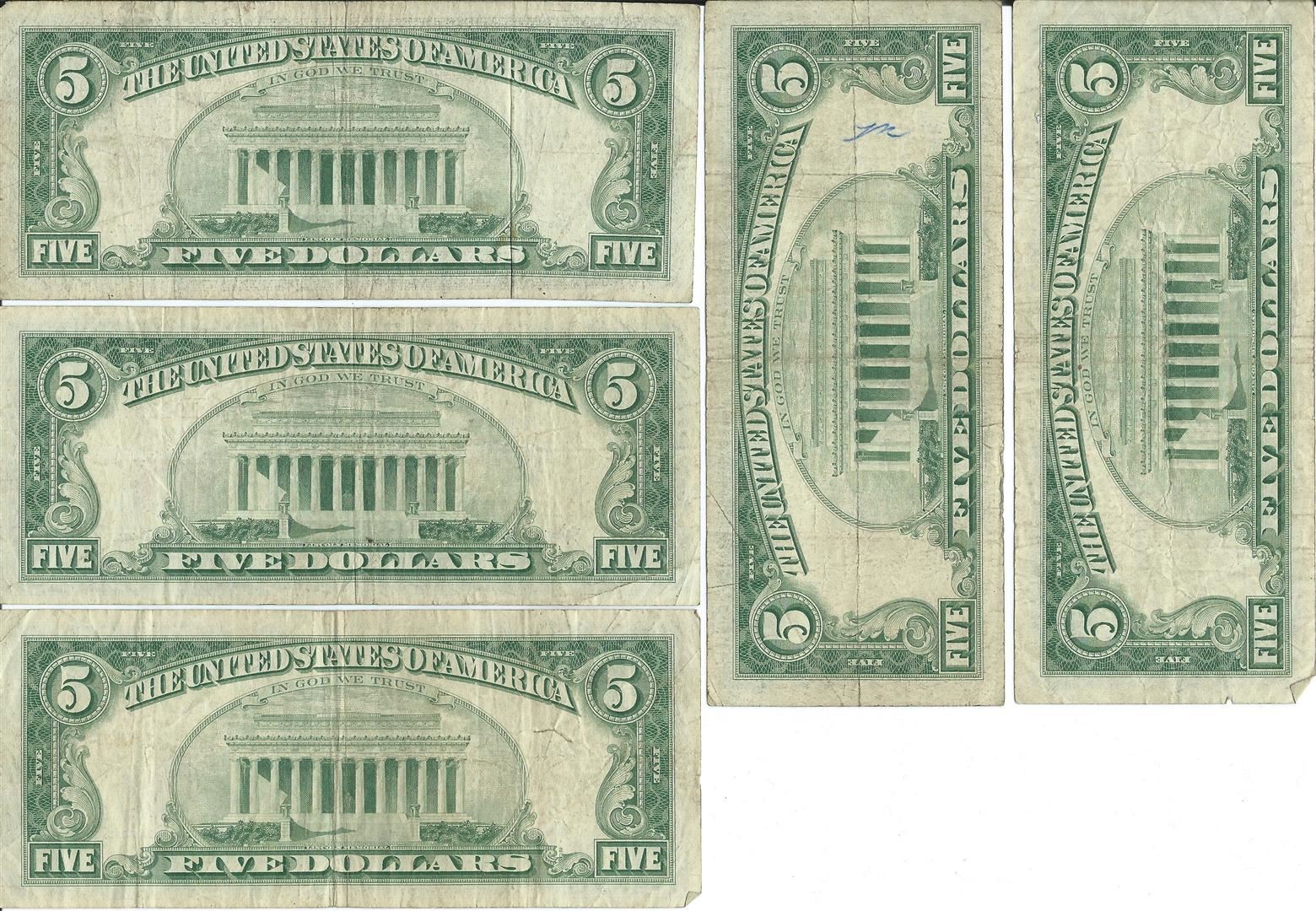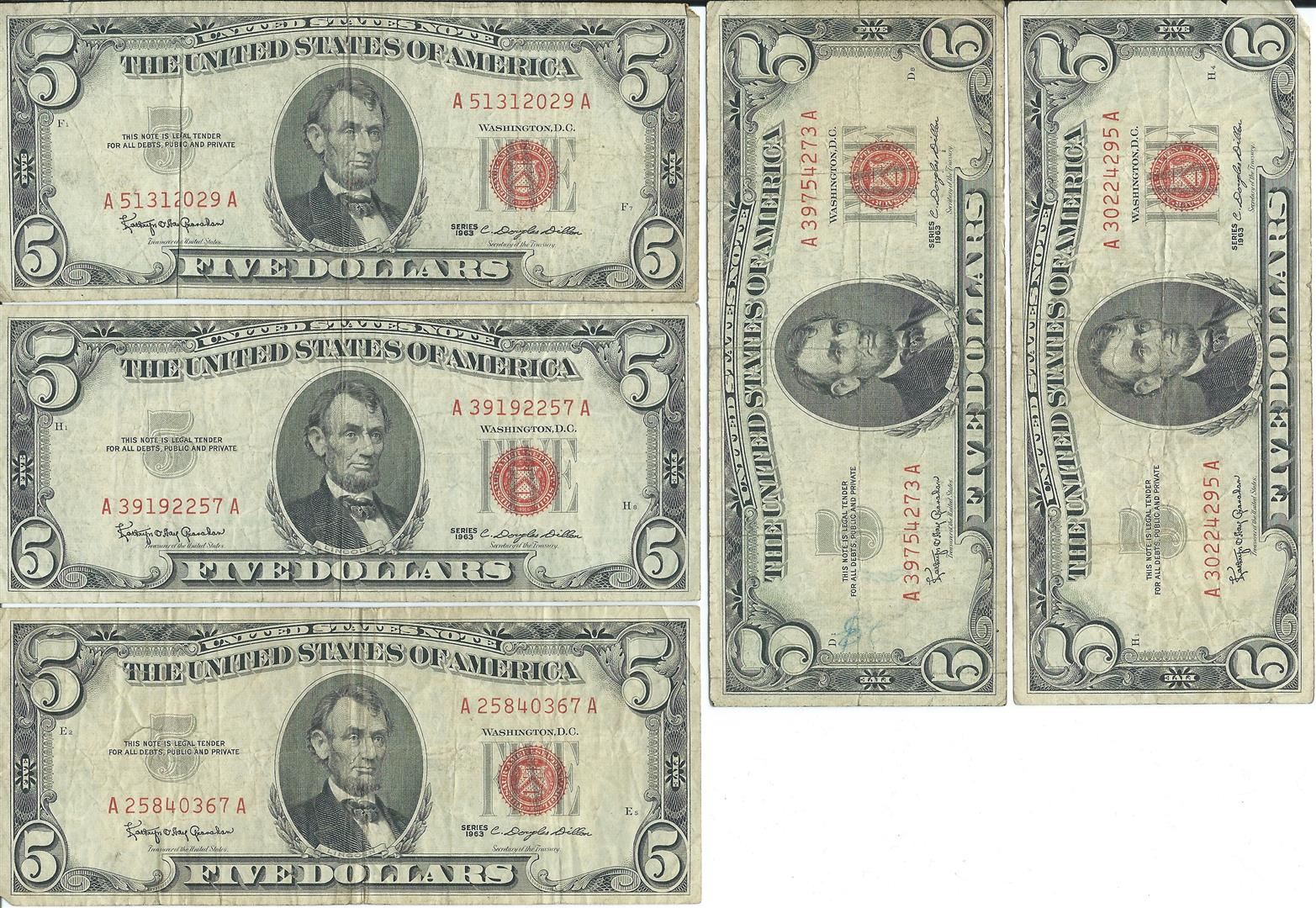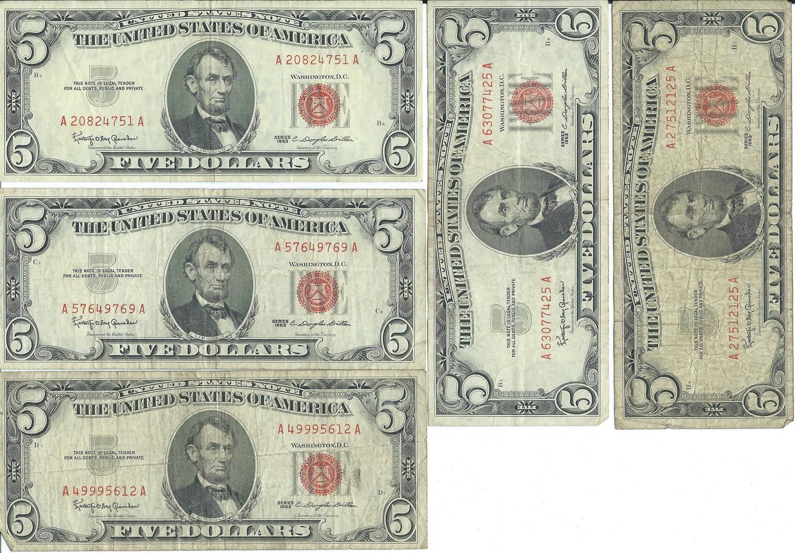 1963 $5 Red Seal Bill Lot of 10.