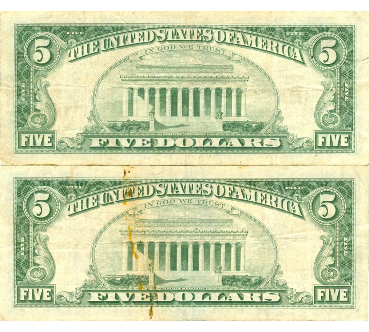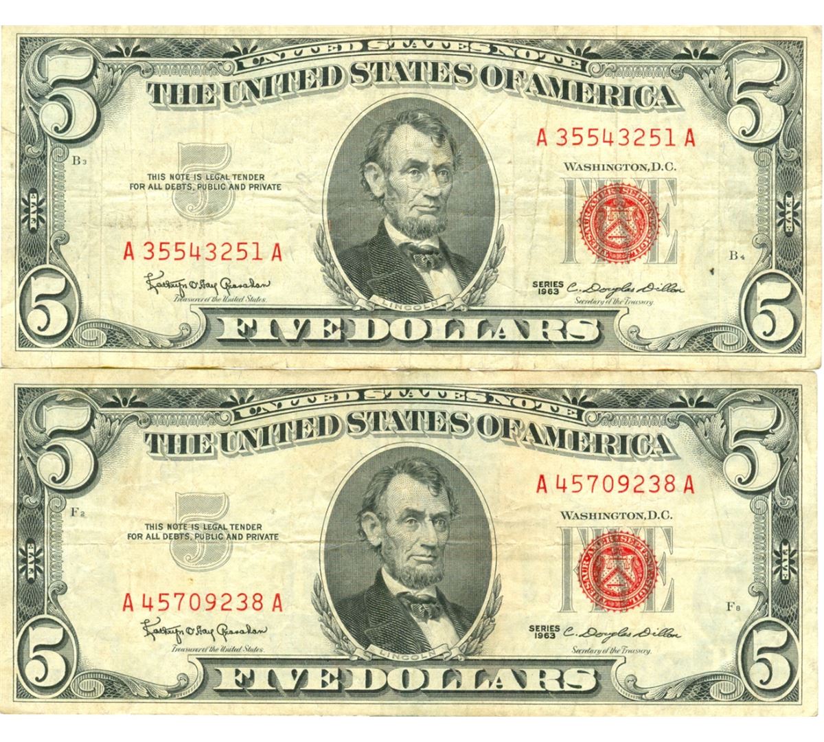 1963 $5 Red Seal Bill Lot of 2. Pictures represent the bills.