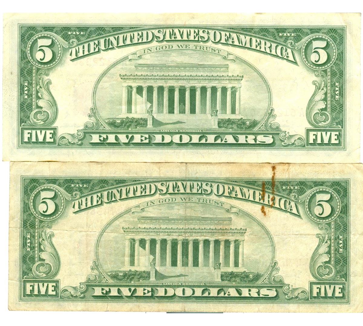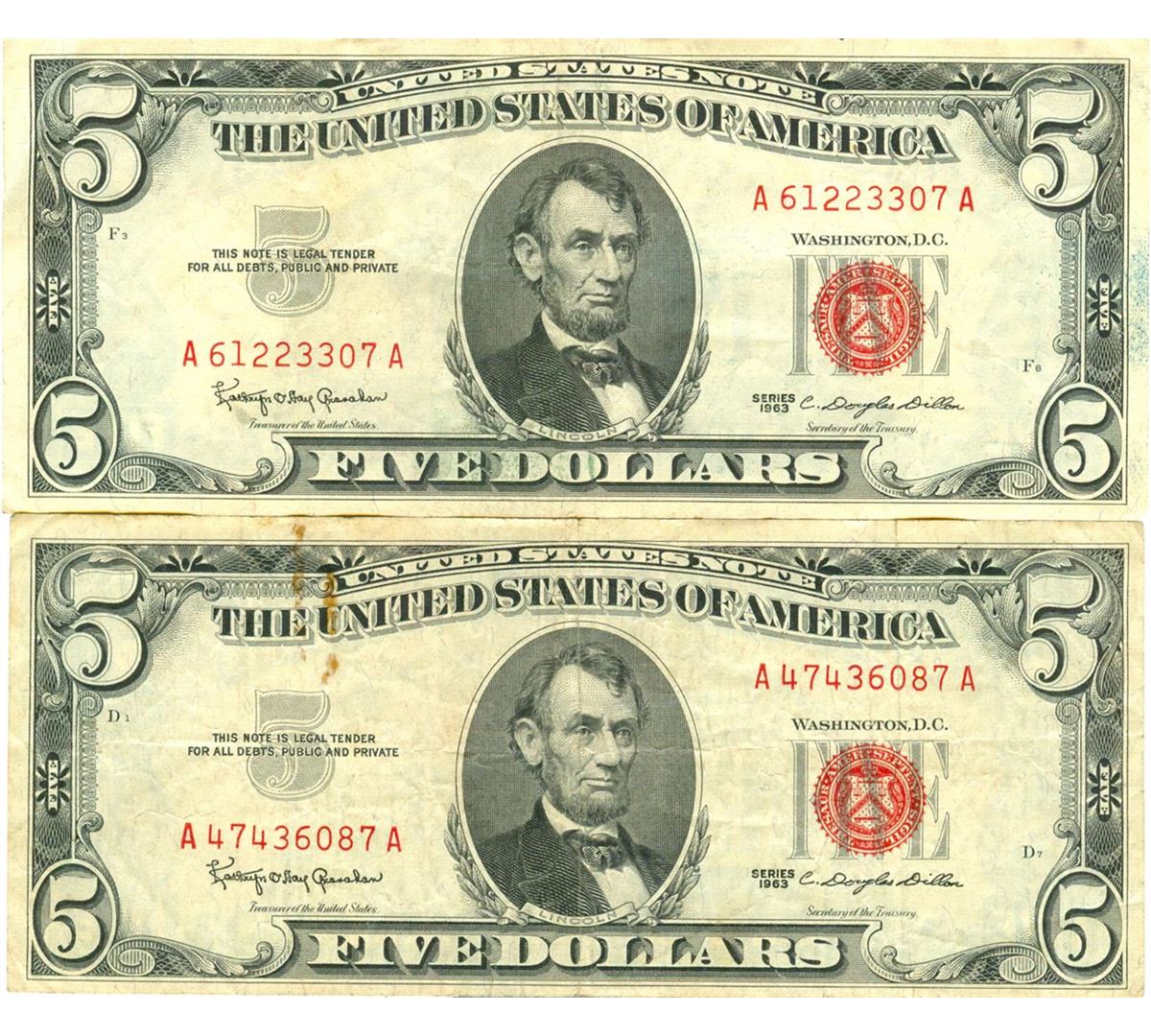 1963 $5 Red Seal Bill Lot of 2. Pictures represent the bills.
