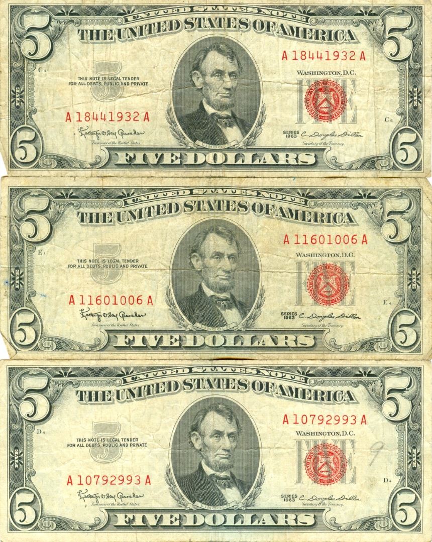 1963 $5 Red Seal Bill Lot of 3. Pictures represent the bills.