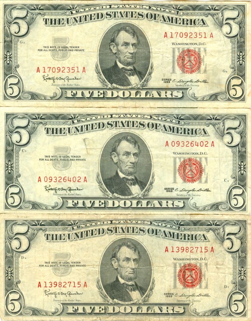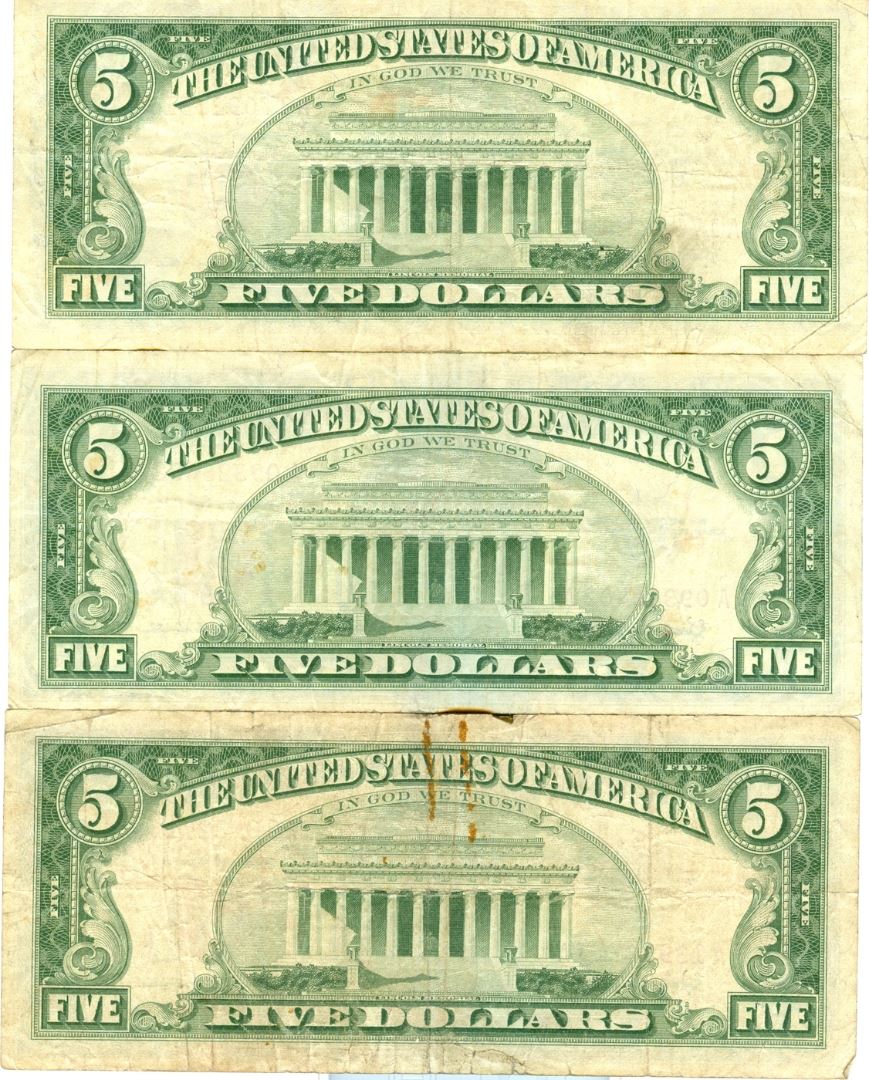 1963 $5 Red Seal Bill Lot of 3. Pictures represent the bills.