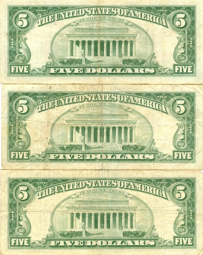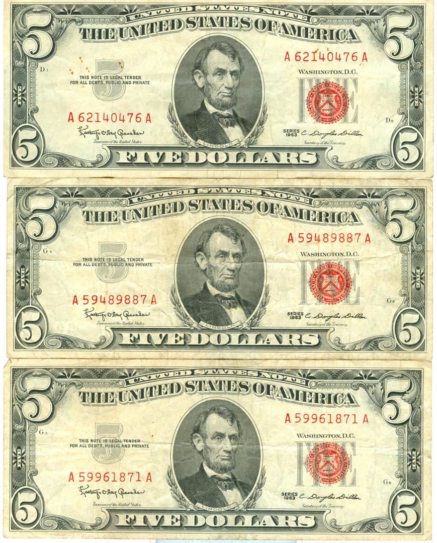 1963 $5 Red Seal Bill Lot of 3. Pictures represent the bills.