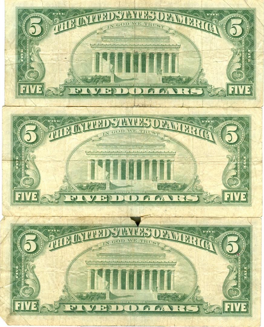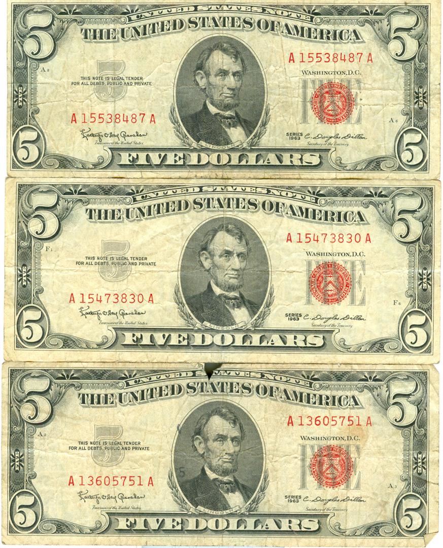 One 1963 $5 Red Seal Bill Lot of 3. The pictures represent the bills.