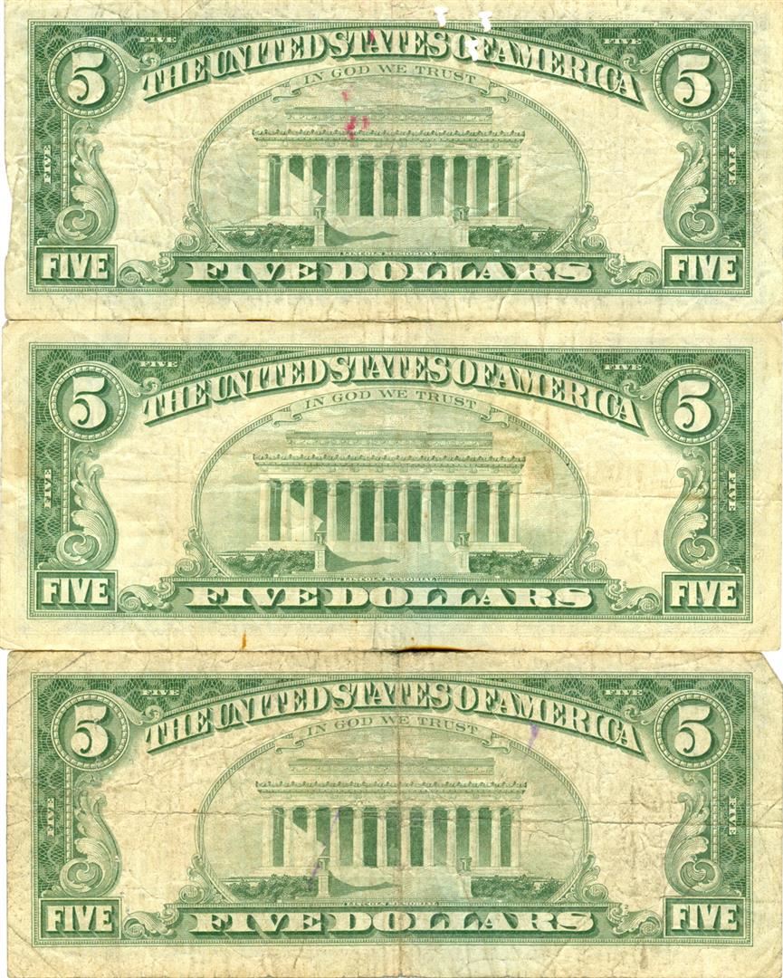 1963 $5 Red Seal Bill Lot of 3. Pictures represent the bills.