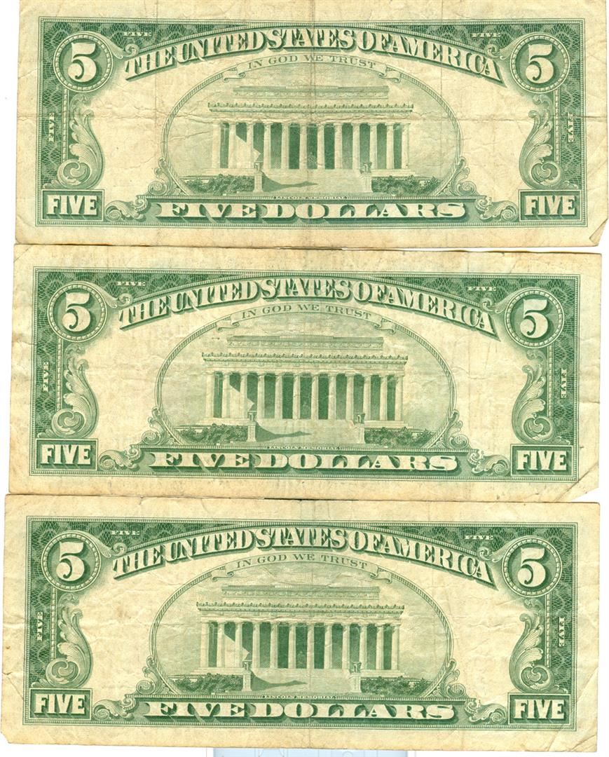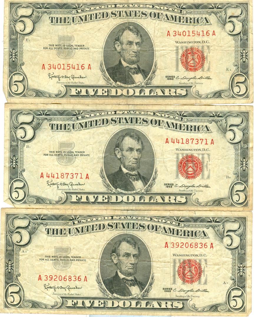 1963 $5 Red Seal Bill Lot of 3. Pictures represent the bills.