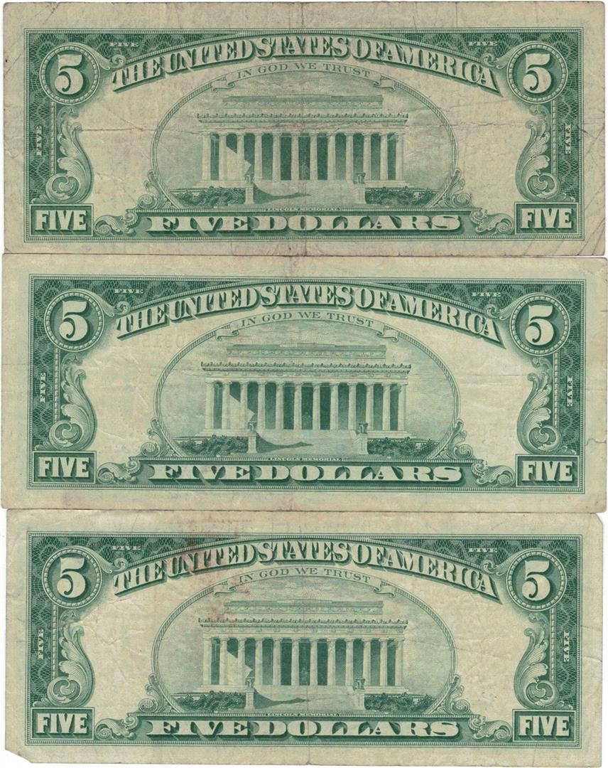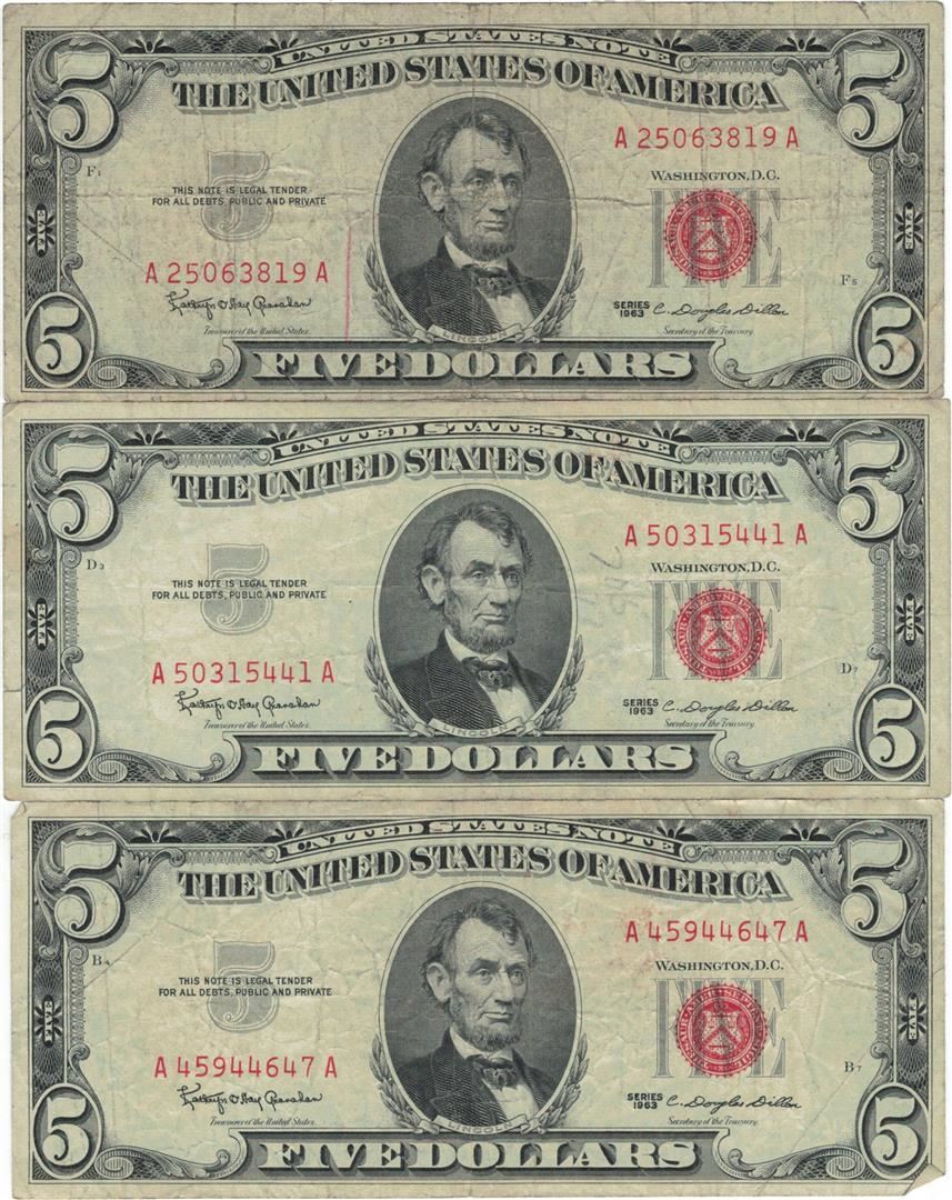 1963 $5 Red Seal Bill Lot of 3.