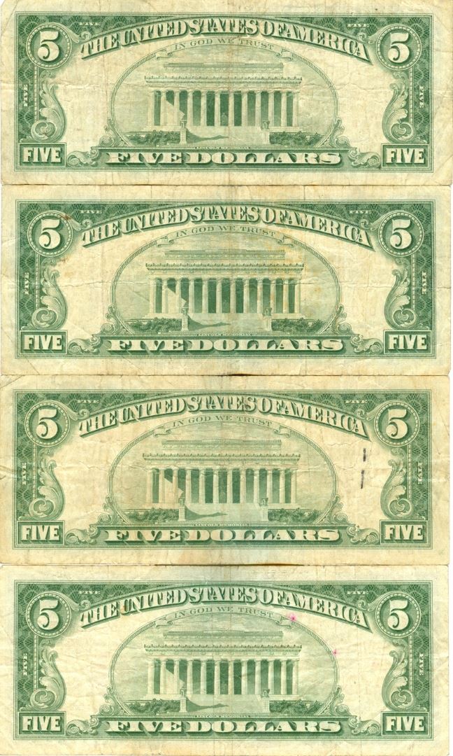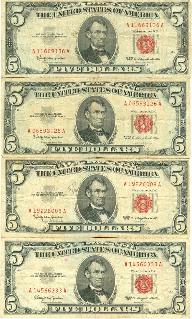 1963 $5 Red Seal Bill Lot of 4. Pictures represent the bills.