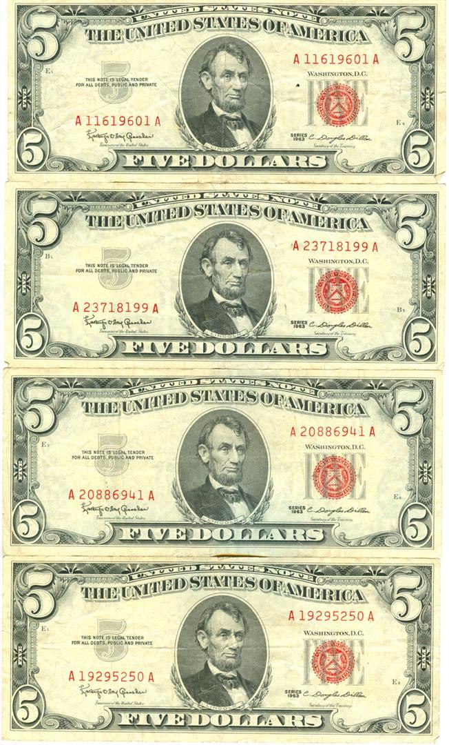 1963 $5 Red Seal Bill Lot of 4. Pictures represent the bills.
