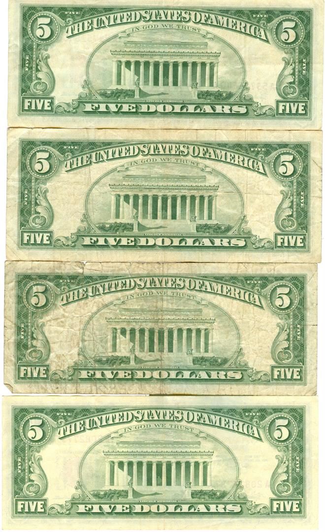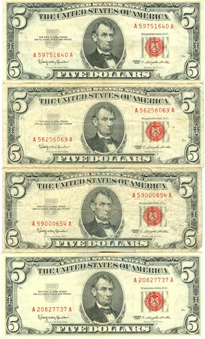 1963 $5 Red Seal Bill Lot of 4. Pictures represent the bills.