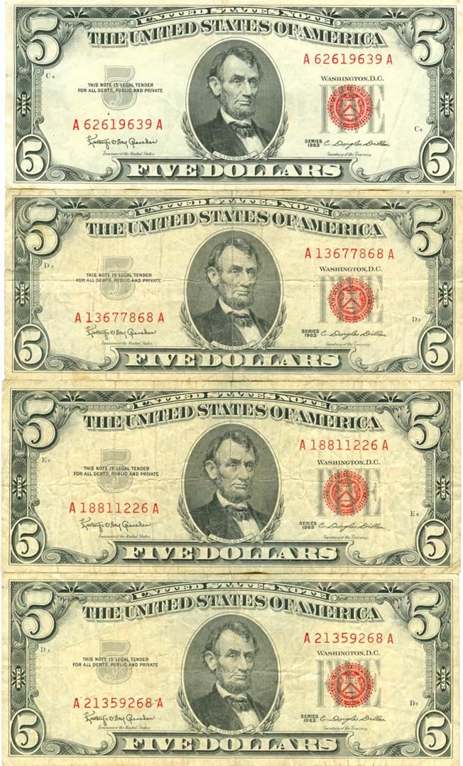 1963 $5 Red Seal Bill Lot of 4. Pictures represent the bills.