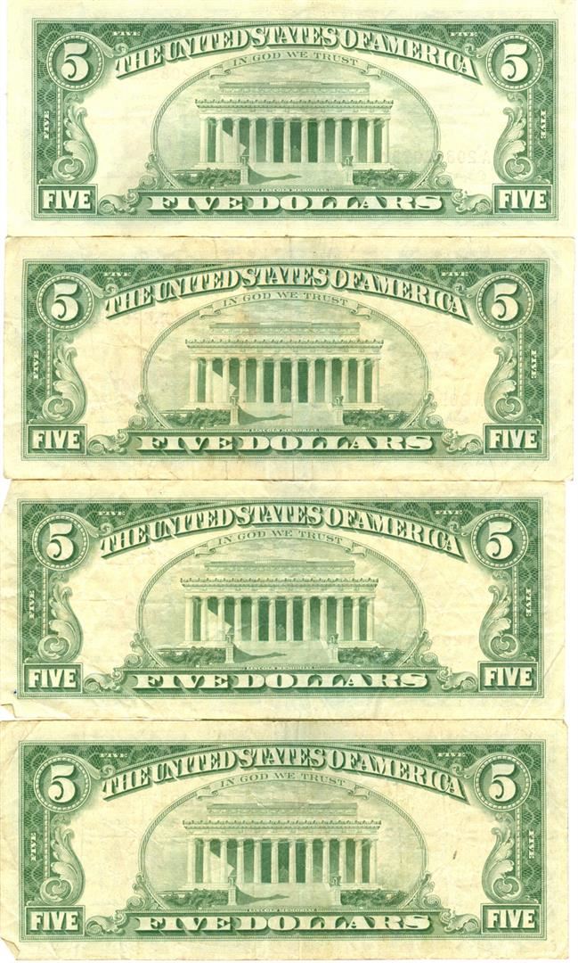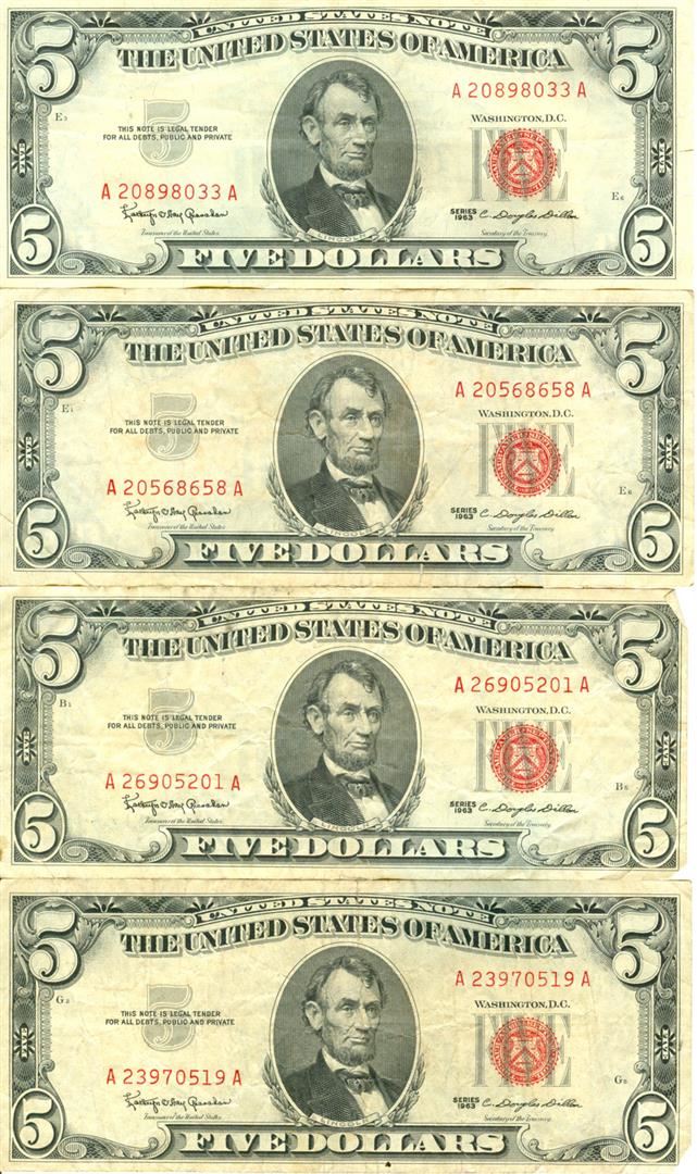 1963 $5 Red Seal Bill Lot of 4. Pictures represent the bills.