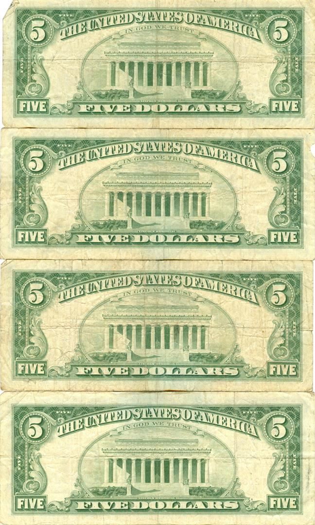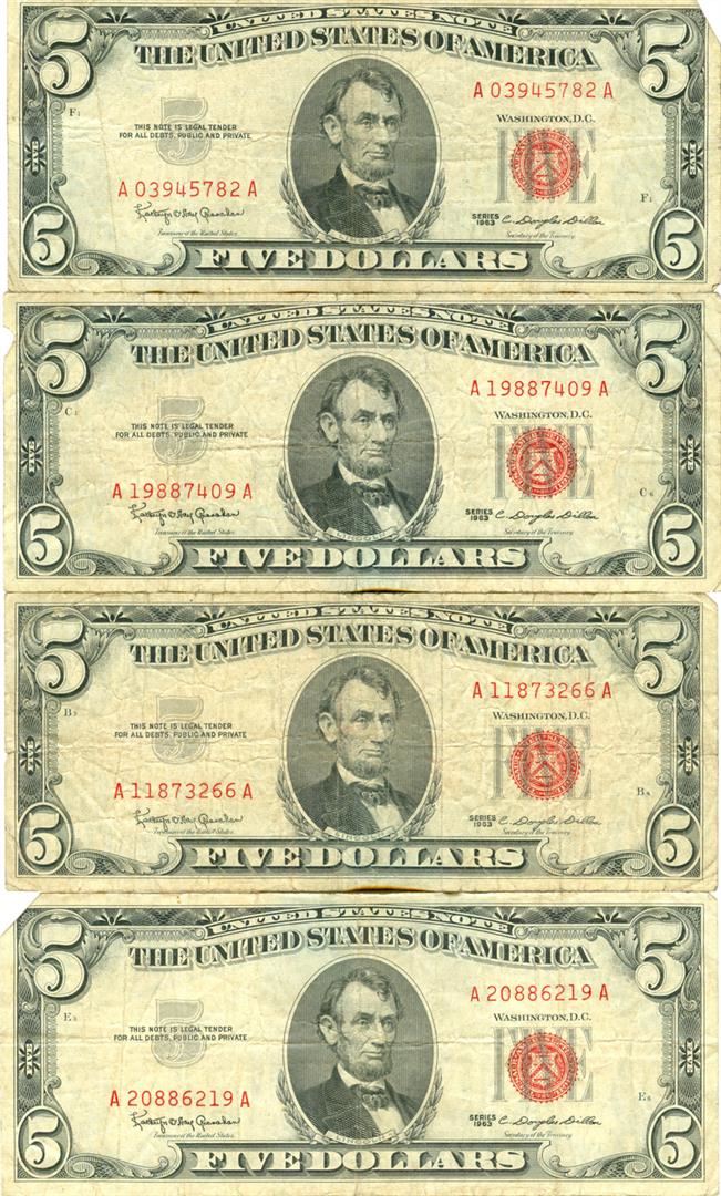 1963 $5 Red Seal Bill Lot of 4. Pictures represent the bills.