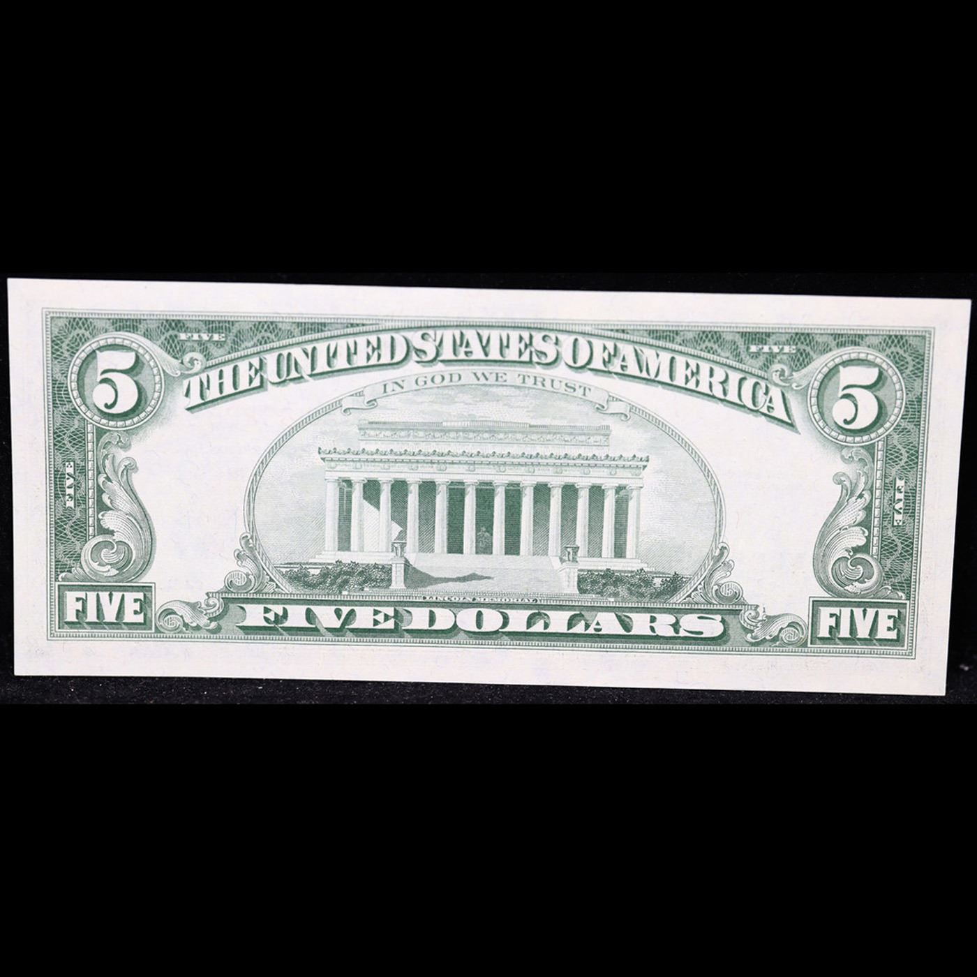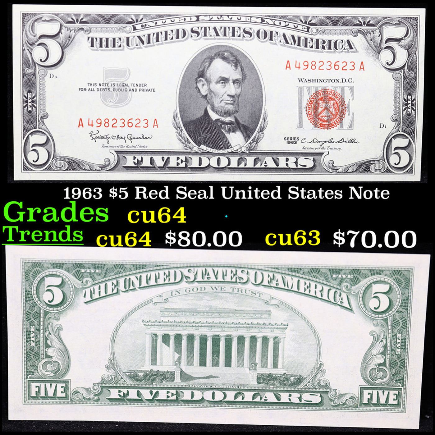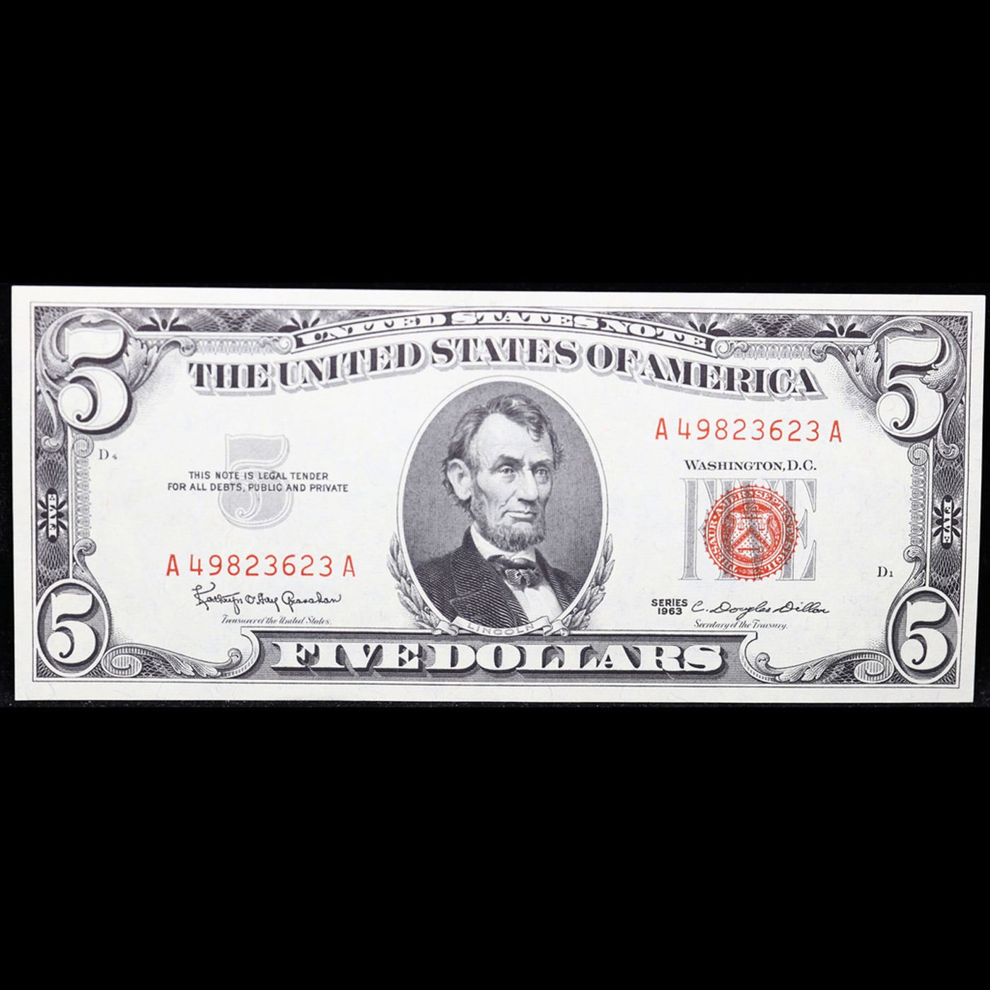1963 $5 Red Seal United States Note Grades Choice CU. Each 1963 five dollar red seal bill has serial number written in red ink. There is a red seal on the right hand side of the bill. All 1963 red seals were printed in Washington DC and feature a portrait of Abraham Lincoln in the center of the bill. You can also find the following wording on each bill, “United States Note, The United States of America, This Note Is A Legal Tender At Its Face Value For All Debts Public And Private, Will Pay To The Bearer On Demand Five Dollars”